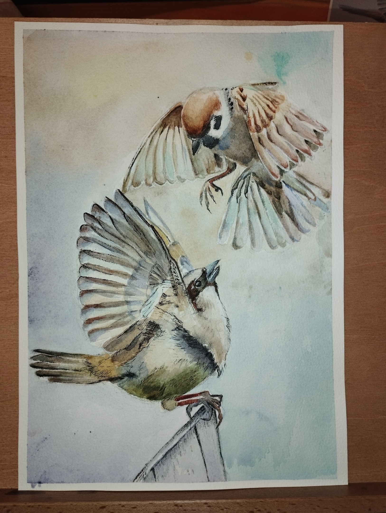 Использовала компоновку, для того чтобы сделать птичек ближе и вместить их в лист А4. Также добавила красок для придания воздуха, атмосферы озорства и витальности.