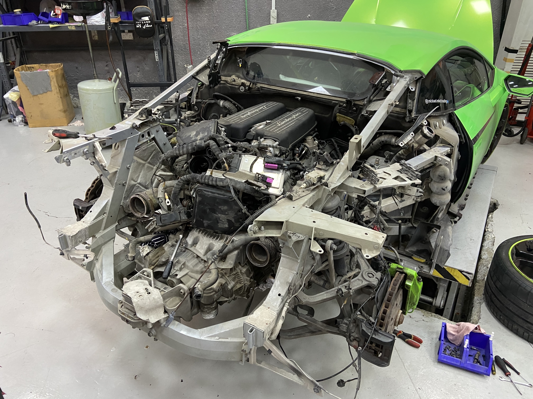 За вчера и сегодня был неспешно снят мотор V10 с этой зелёной «ламбы». Двигатель один в один как на Audi R8. Повсюду присутствуют лого Audi.