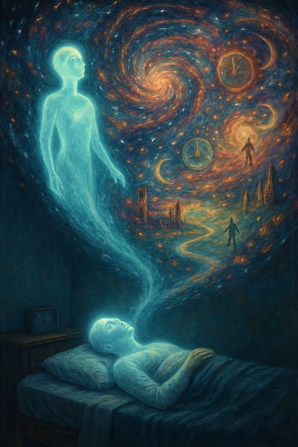 Переход в Пограничный Слой: Когда ваше тело погружается в сон, сознание отключается от медленного, последовательного ритма Материального Слой. В этот момент мозг, как сложный электрический приёмник, начинает напрямую взаимодействовать с чистой Энергией (электричеством) Поля Ψ, которая концентрируется в Пограничном Слое.