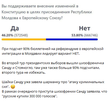 Против вступления Молдавии в ЕС на референдуме проголосовали 52,29% избирателей, за - 44,71% (ЦИК после обработки 70,1% протоколов).