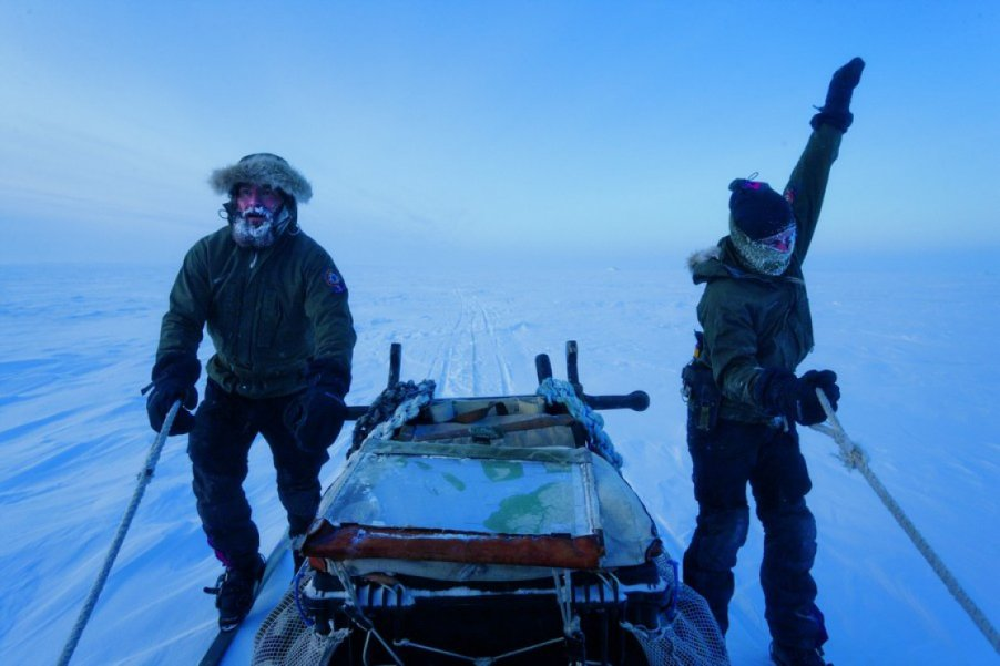 Вращая руками, чтобы избежать обморожения, Джеспер Олсен (справа) и Расмус Йоргенсен бегут на лыжах рядом с санями, на которые погружены их припасы: винтовки, рация, аптечка, палатка, спальные мешки, большая карта и много собачьей еды.