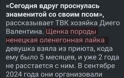 «Сегодня вдруг проснулась знаменитой со своим псом», рассказывает ТВК хозяйка Диего Валентина. Щенка породы ненецкая оленегонная лайка девушка взяла из приюта, кода ему было 5 месяцев, и уже 2 года не расстается с ним. В сентябре 2024 года они организовали фотосессию с красноярским фотографом Юлией Бец. Выбор локации пал на вершину «Красный Гребень» на Торгашинском хребте.