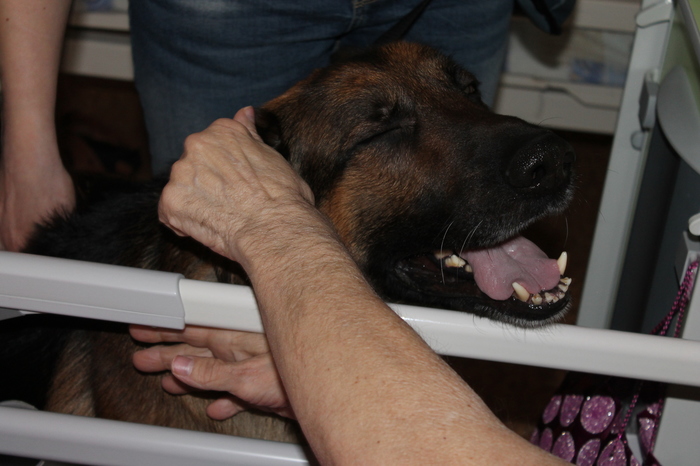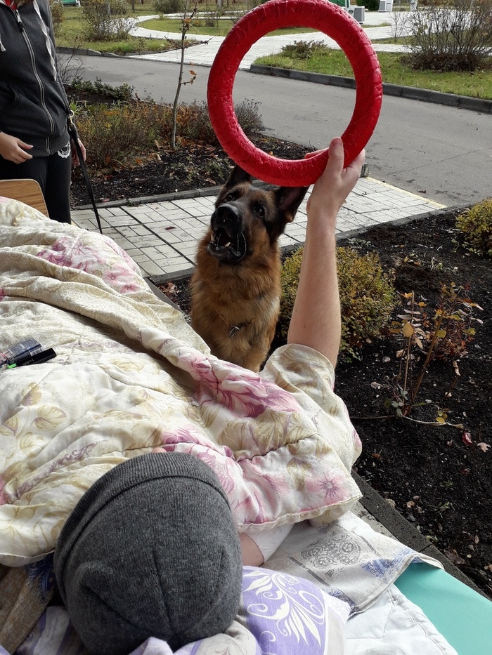 Нас всегда встречают очень радостно, кто может встать - встает и сам подходит к собаке(но таких людей единицы), в основном пациенты лежачие, слабые, не способные встать или даже перевернутся, к таким пациентам мы подходим сами - люди гладят собаку, чувствуют его теплое дыхание, мягкую шерсть, трогуют мокрый нос, бархатные уши, усы щекочут их ладошки...если есть силы они играют с Арнольдом в мячик