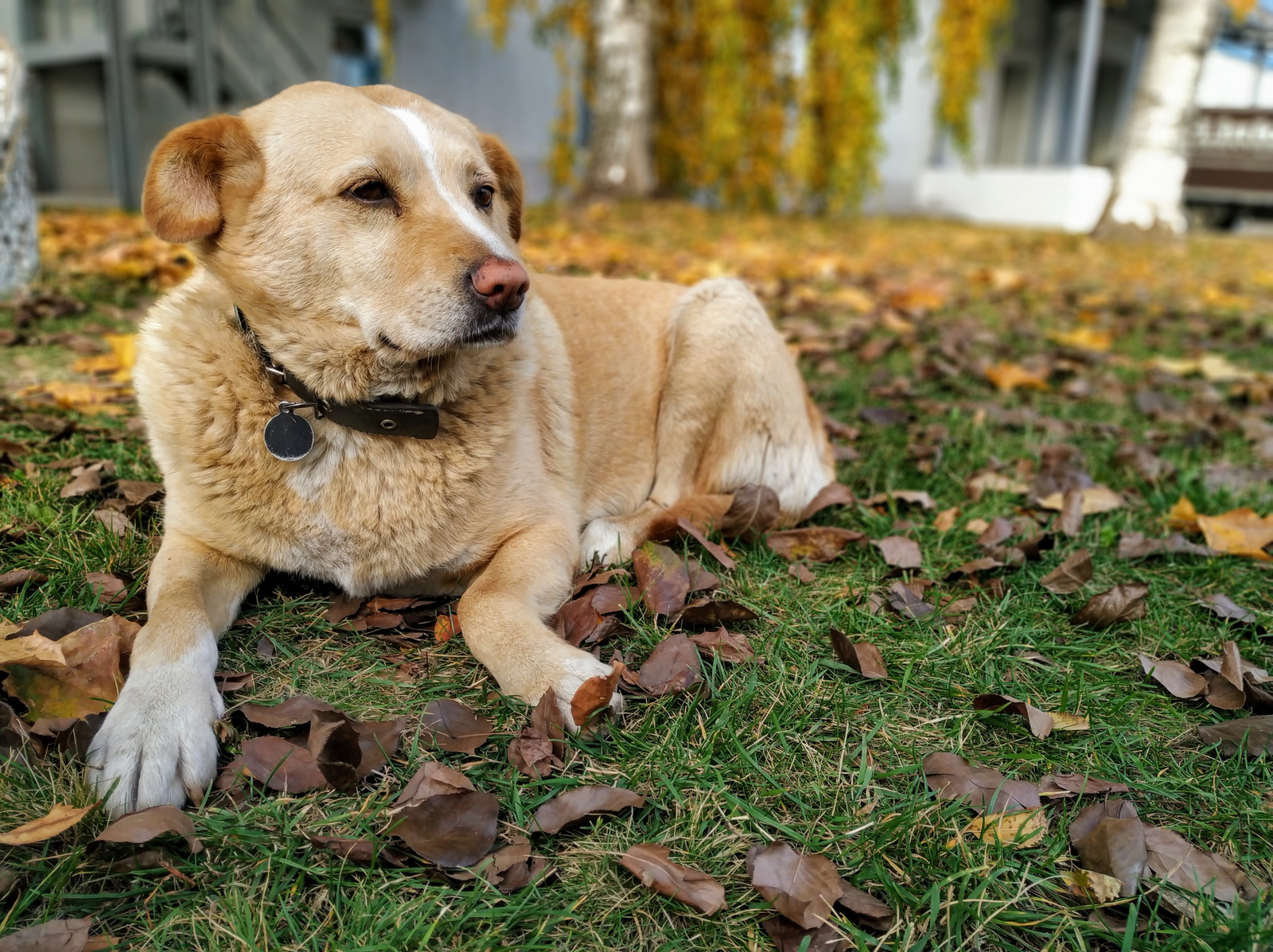 Эта собачка живёт на работе, охраняя большую территорию. Но после того, как её лишили прелестей жизни (вы понимаете о чём я), она (естественно) стала ленивой задницей, а потому стала толстеть... дошло до того, что она перестала пролазить под входной дверью... и вот таким взглядом она просила её пропустить.