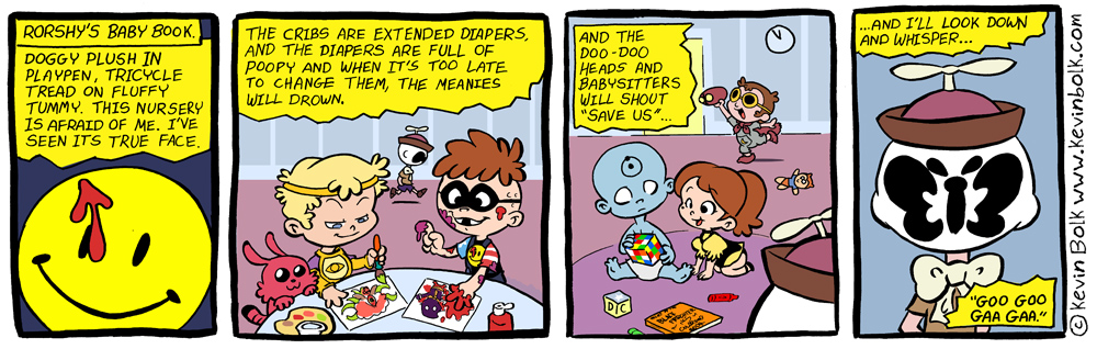 В первых трех картинках "стандартный" текст Роршаха в немного детском варианте, не главное (и я не особо понял пока :( ), соль в конце - "...И я взгляну на них вниз, и прошепчу: "Гугу, га га!"".