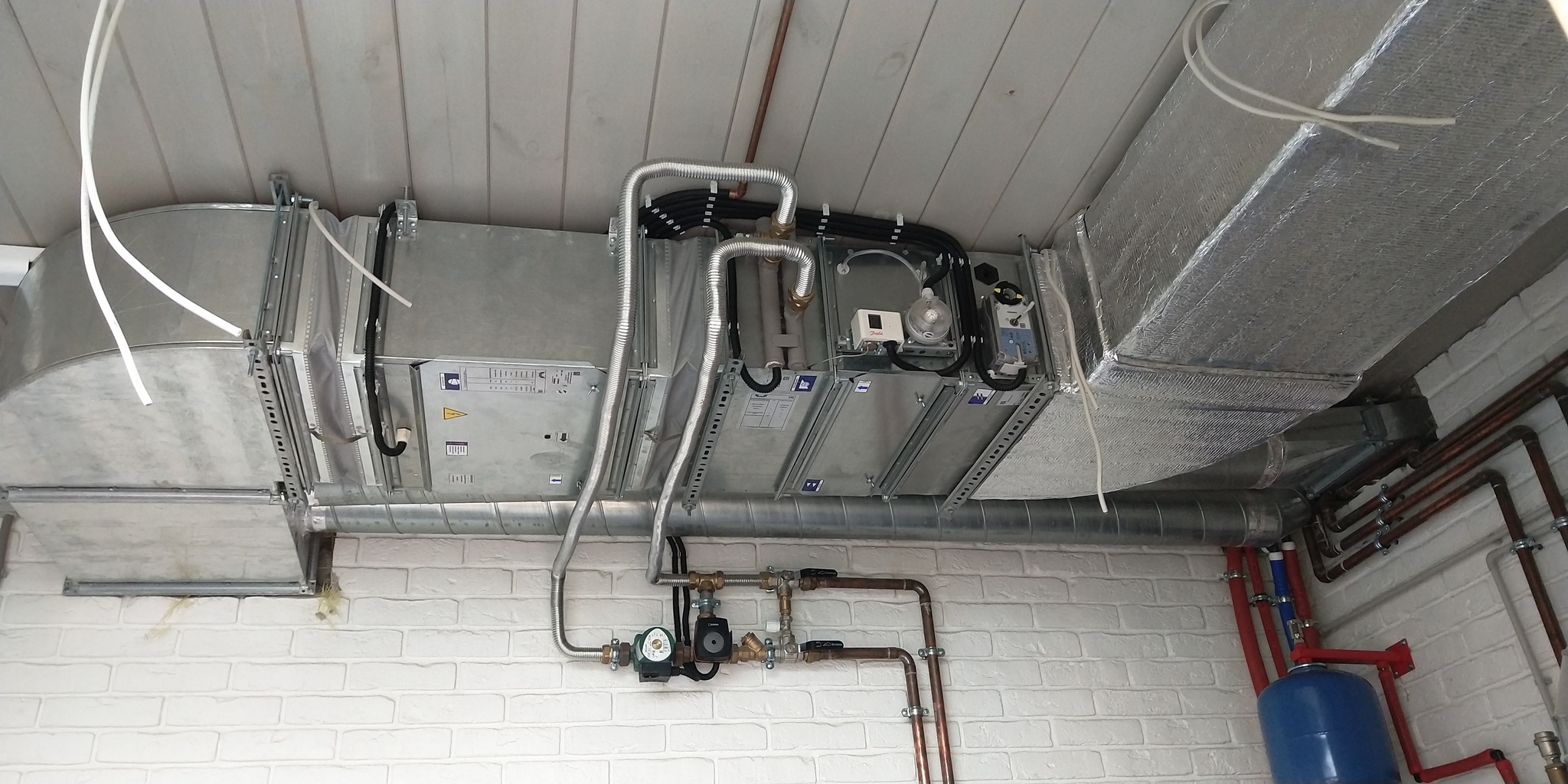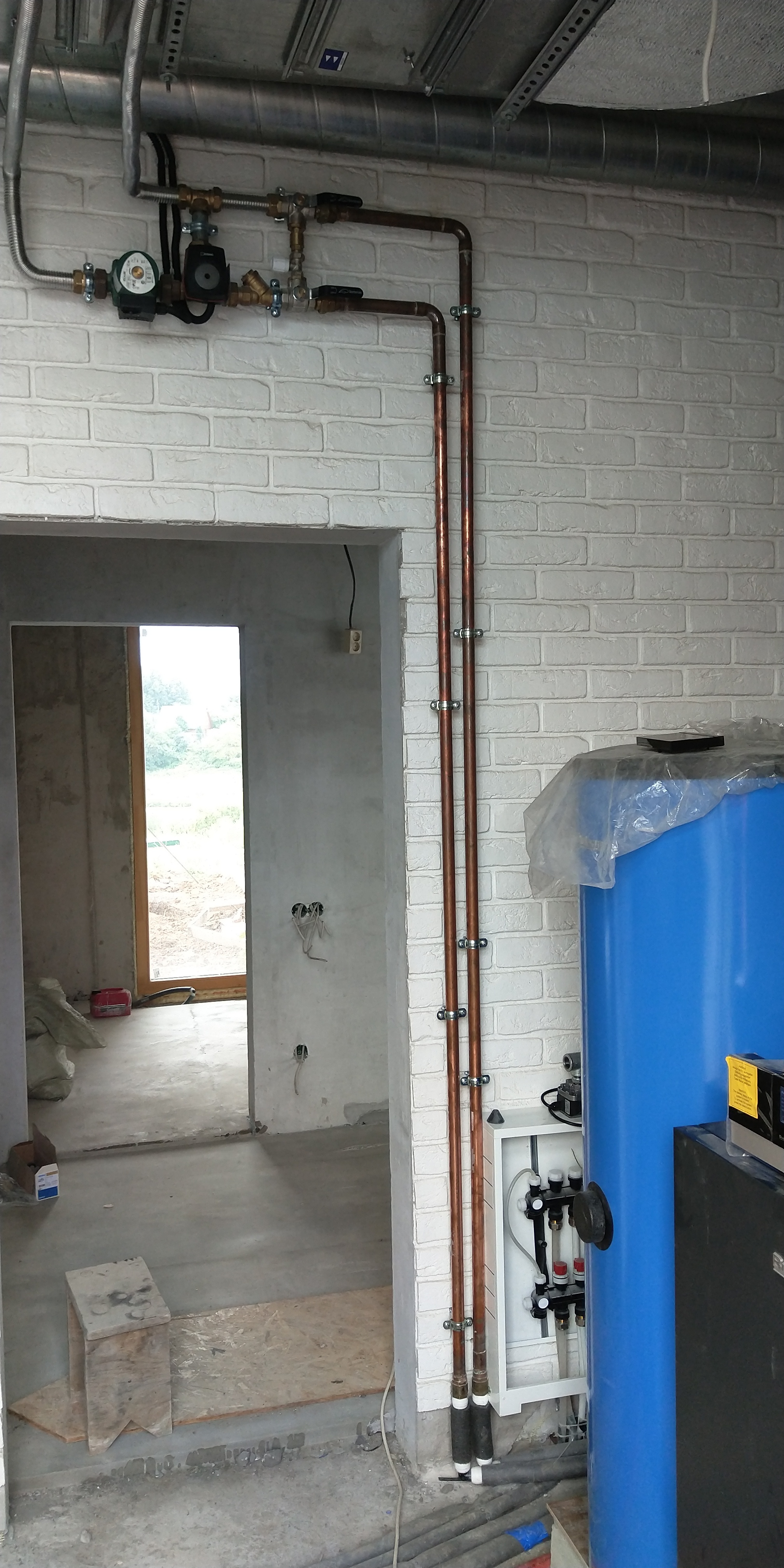 В котельной добавил узел обвязки приточной установки (над дверным проёмом). Подвод к узлу сделал медью, подключение к колориферу приточки - гибкой нержавейкой.