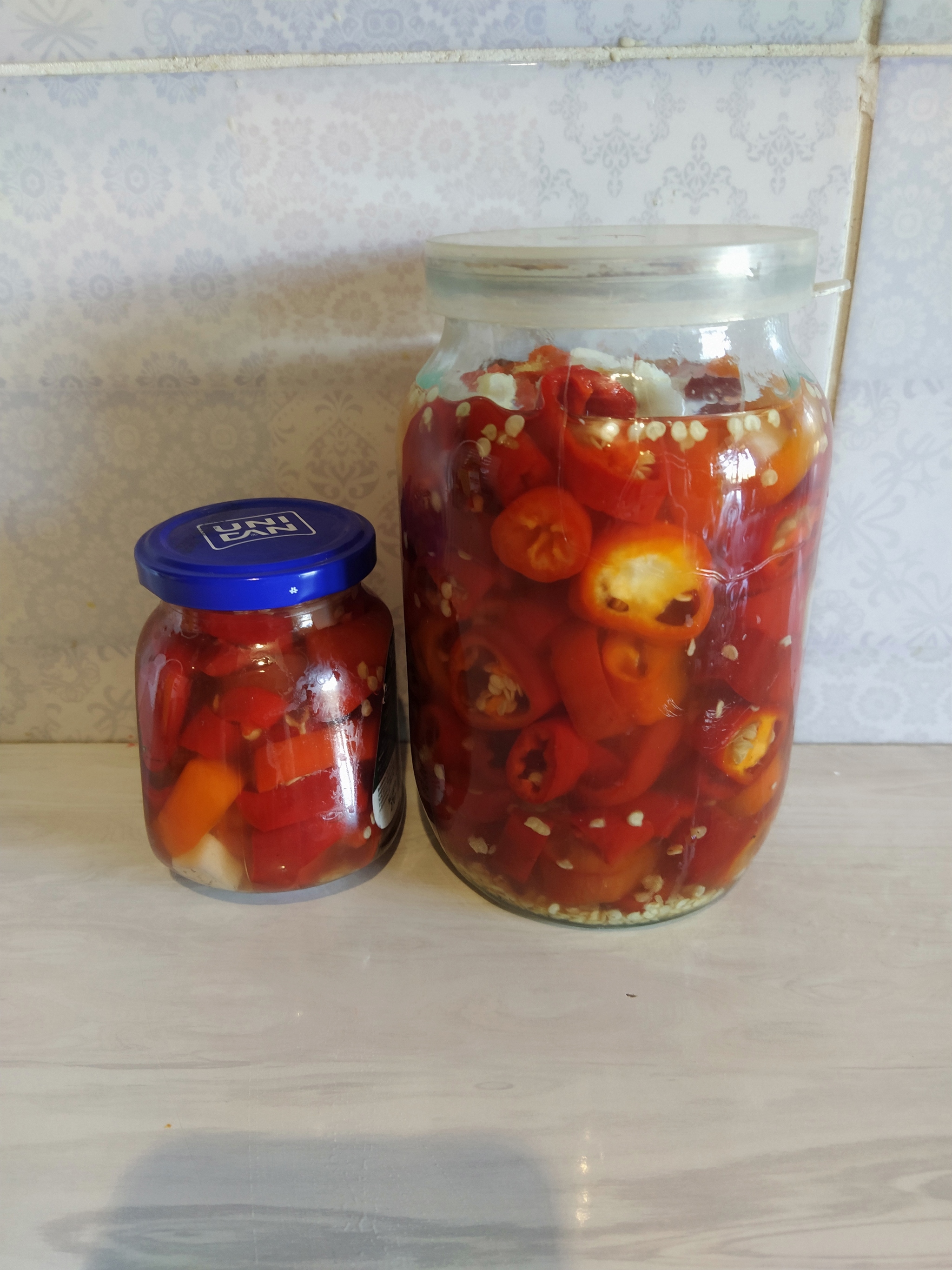 Достал последнюю баночку прошлогоднего. Кисло сладкий! Можно меда 3 ложки положить, если сладко. Зато перец хрумкий, а в маридан потом клево шашлыки макать, колбаски. Он по остроте самое то!