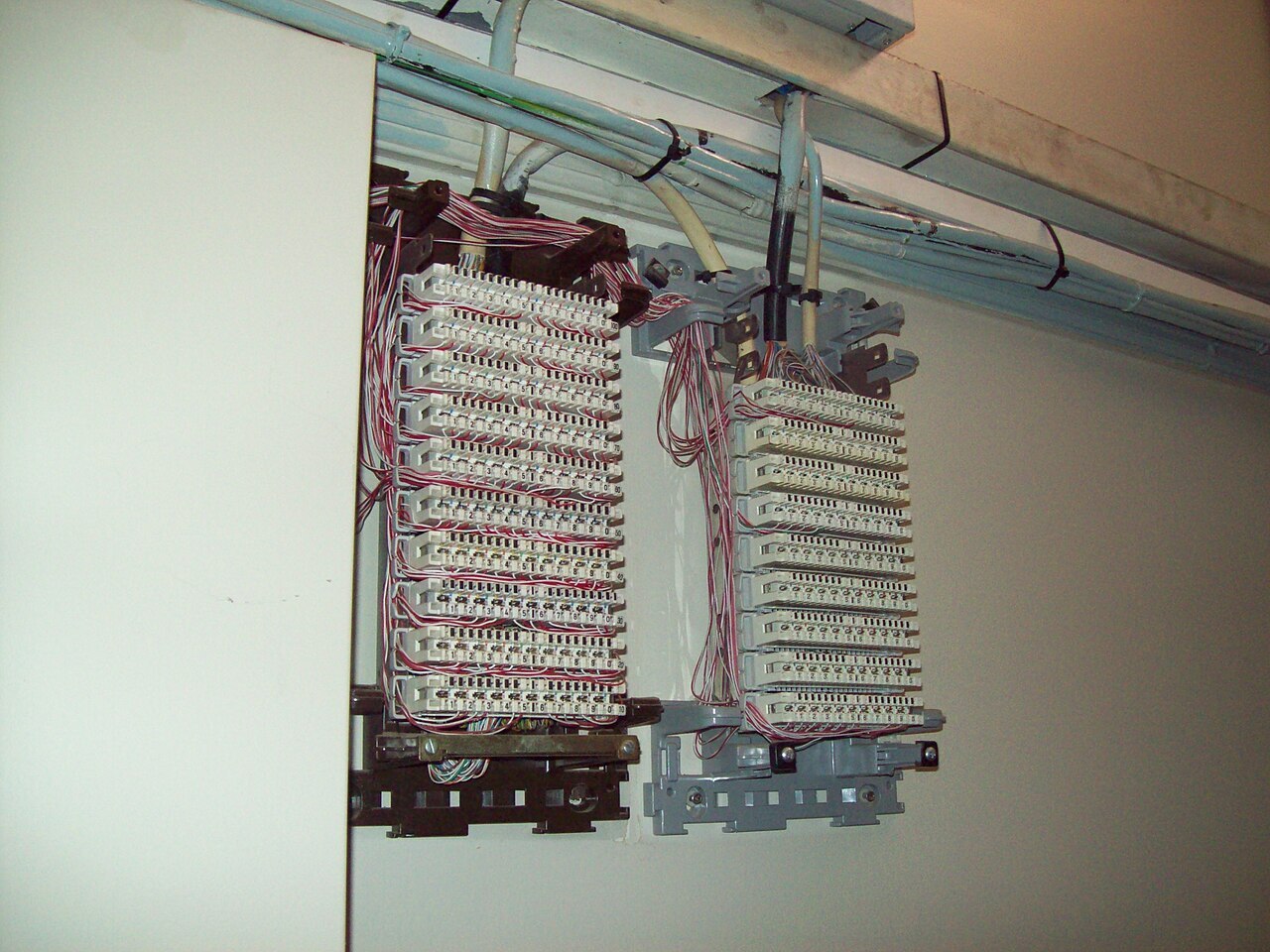 Это медный кросс, собранный на плинтах. На нижней фотографии тоже медный кросс, собранный на патч-панелях. Понятно, что плинты появились первыми, еще до IEEE 802.3i, принятом в 1990 году, и TIA568-A, принятого в 1995 году, также как в СССР ксероксы марки «Ксерокс», а в Монголии — ксероксы марки «Кенон», так и повелось.