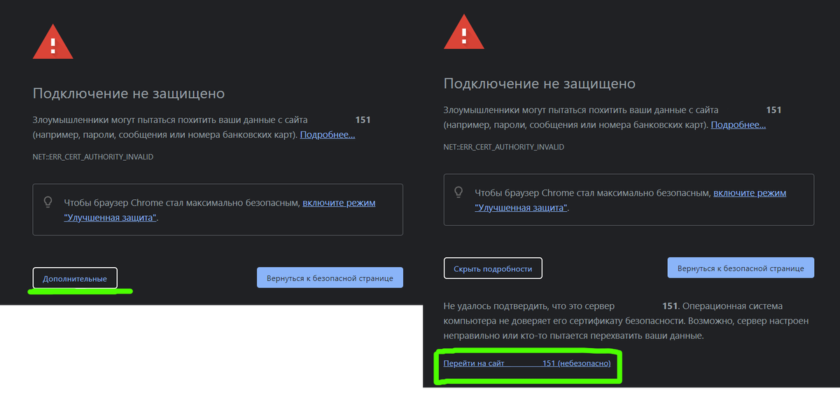 Если на странице вы увидите сообщение подобно тому, что ниже, то это нормально, дело в том что сертификат SSL, который используется для защиты страницы является самоподписным. Просто выберите «Дополнительные» и перейдите по ссылке.