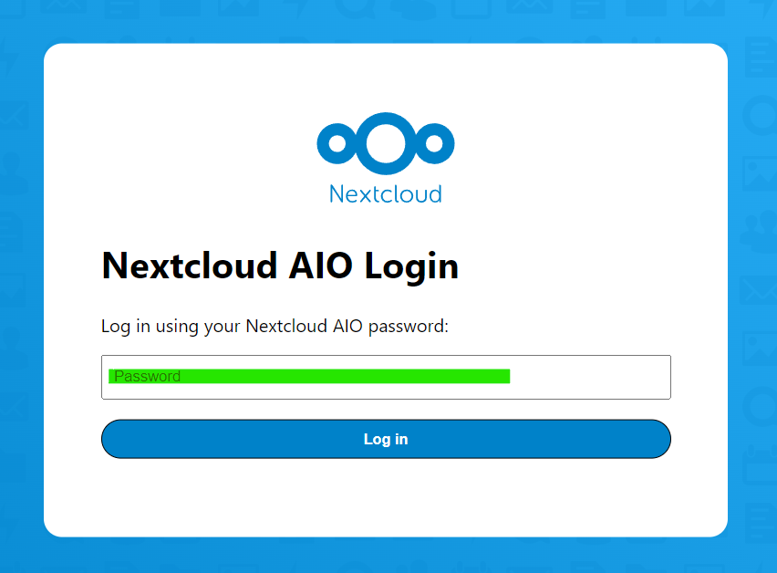 Только после того как вы скопировали и сохранили пароль можно переходить по кнопке "Open Nextcloud AIO login", на следующей странице сразу же попросят этот пароль ввести, чтобы убедиться, что у вас есть к нему доступ. Вводим пароль и логинимся.