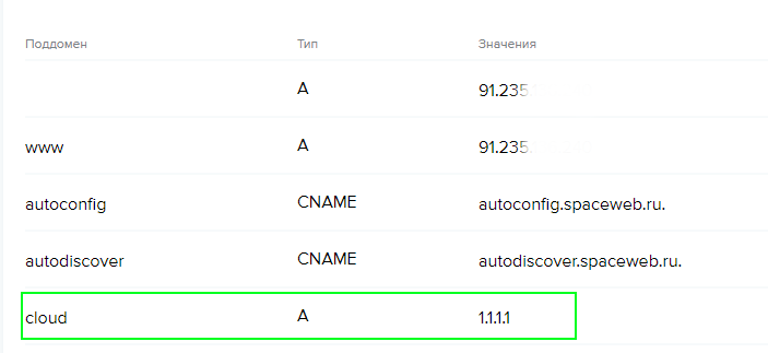 Я хотел сделать все красиво, поэтому сервис решил разместить на домене своей компании. Для этого надо сделать «A» запись у регистратора домена, в моем случае я остановился на банальном cloud. Имя поддомена указывается без точки в конце, в качестве значения адреса указывается IP адрес сервера.