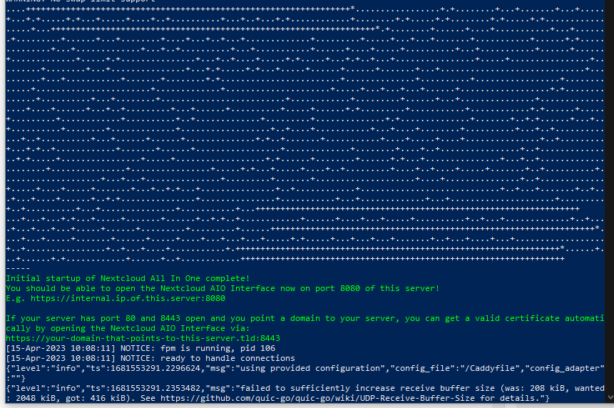 sudo docker run --sig-proxy=false --name nextcloud-aio-mastercontainer --restart always --publish 80:80 --publish 8080:8080 --publish 8443:8443 --volume nextcloud_aio_mastercontainer:/mnt/docker-aio-config --volume /var/run/docker.sock:/var/run/docker.sock:ro nextcloud/all-in-one:latest