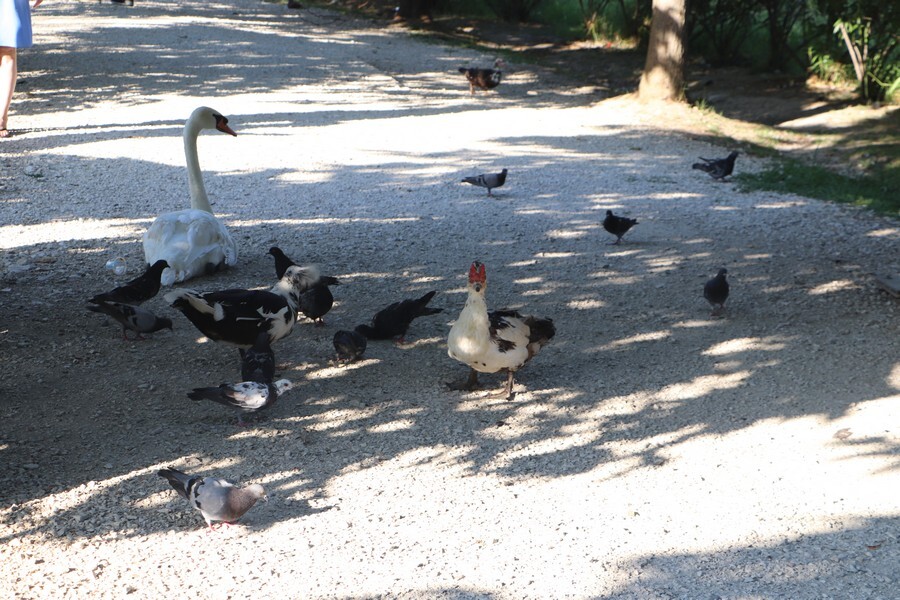 Посетители, хоть это и запрещено, кормят птиц прямо на дорожках. На кормежку слетаются и сбегаются все, кто может.