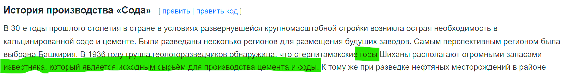 Вывод 3. По информации из википедии, исходные компоненты для соды накопали из стерлитамакских шиханов, которые состоят из известняка. Вот честно хз, все это знают или нет, но, моя задача просто показать всю логическую цепочку. Даже если я говорю какие-то банальные и общеизвестные вещи.