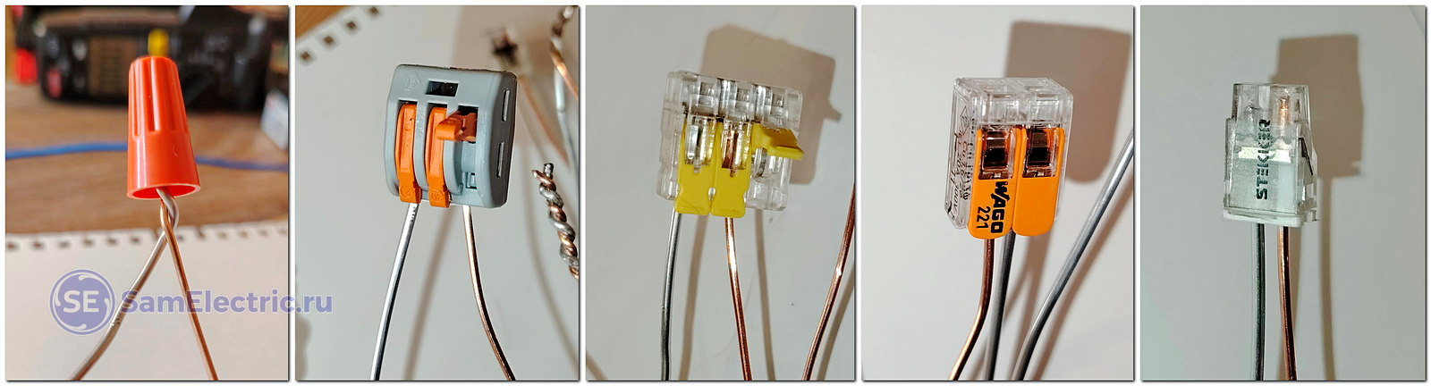 4 Сложность – технологичность, уровень подготовки монтажника, количество инструментов, потраченное на соединение время. Поэтому скрутка и WAGO (СМК) так популярны в народе – на то, чтобы зачистить изоляцию и скрутить жилы (или надеть на них WAGO), нужно всего несколько секунд.