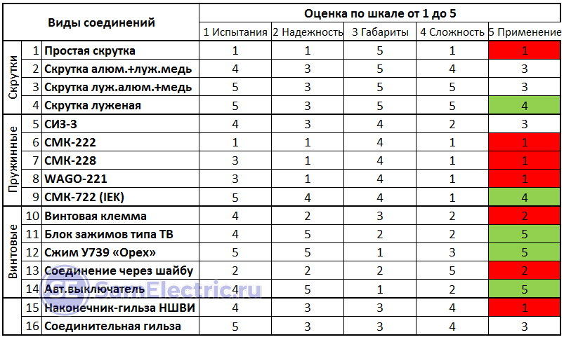 3 Габариты – чем лучше соединение по этой категории, тем выше у него оценка. Поэтому у скруток такая высокая оценка, а у «Ореха» и автомата – такая низкая.