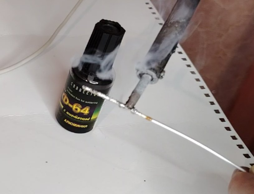 3 Скрутка луженой алюминиевой жилы и голой медной жилы. Алюминиевая жила облужена припоем ПОС-61 с канифолью, предварительно обработана флюсом для алюминия Ф-64.