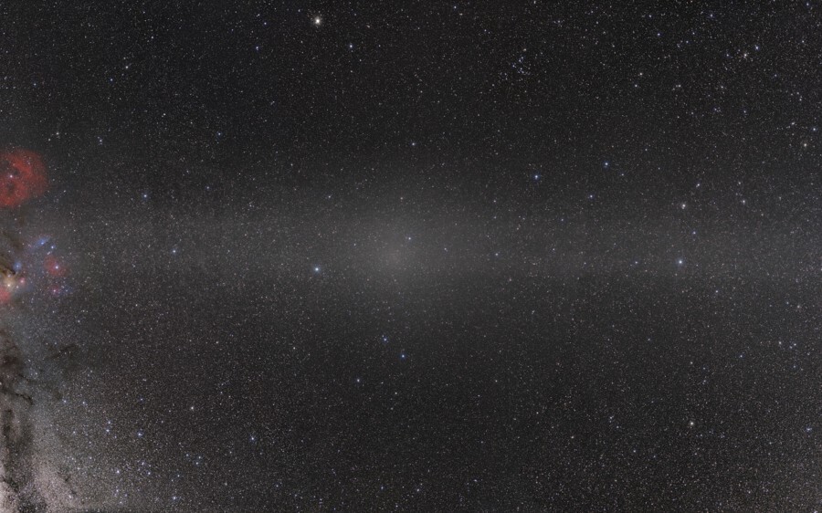 При взгляде на изображение можно обратить внимание на пересекающую ее светлую полосу. Это зодиакальный свет — слабое свечение, наблюдающееся вскоре после захода или перед восходом Солнца. Оно возникает из-за рассеивания солнечного света на частицах межпланетной пыли. Феномен получил свое название из-за постоянной видимости в зодиакальных созвездиях.