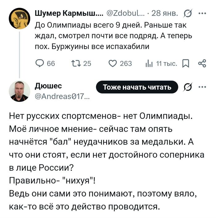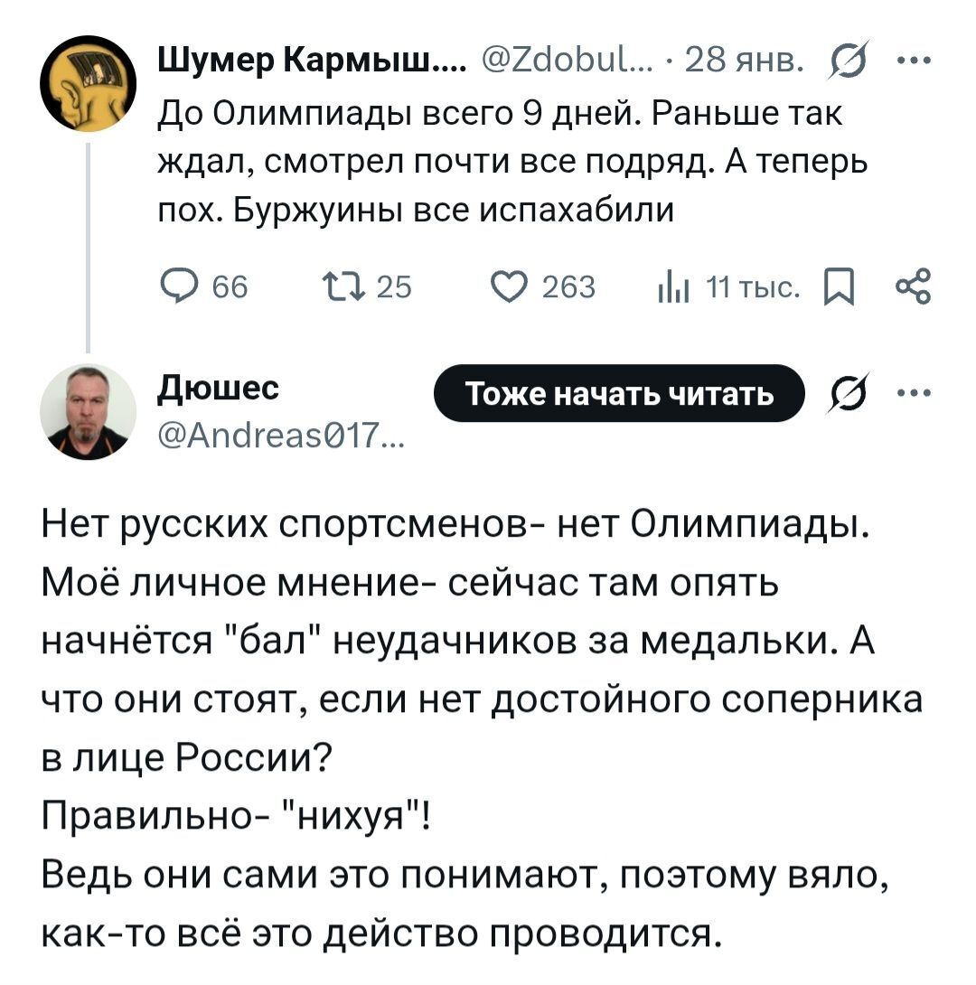168 morevnaM Политика Согласен1 21 час назад От России, конечно, поедут 13 человек. Но поедут они в нейтральном статусе. https://www.kp.ru/sports/olimpiada-2026/ot-rossii-na-olimpia... https://x.com/ZdobulMaydanov/status/2016539146903294028 Россия X (Twitter) Скриншот Политика Спорт Олимпийские Игры Спортсмены Мнение Мат Европа Италия Запад 65 47 1 1 Ещё 0