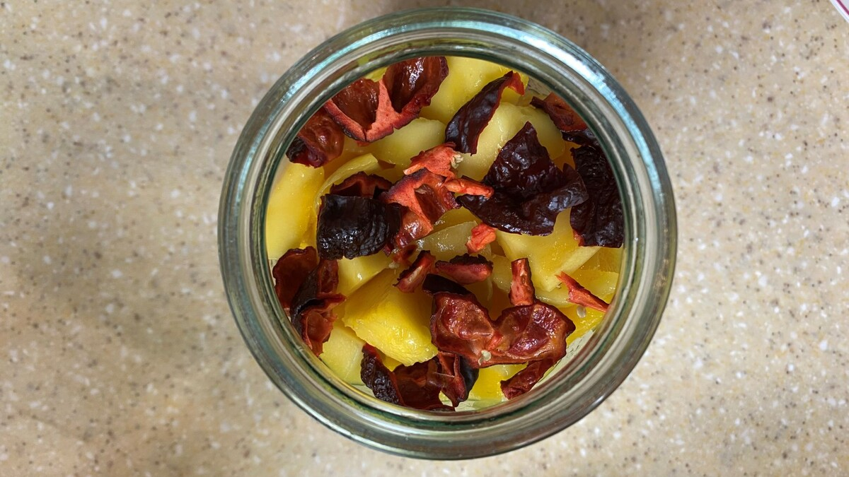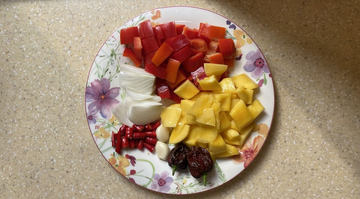 Поскольку острого перца у нас не много, то и другие ингредиенты берем тоже в небольшом количестве. На одну стеклянную банку объемом 1 литр закладываем манго, луковицу среднего размера, болгарский красный перец (для придания цвета), два зубчика чеснока и три маленьких тайских перчика (чисто для небольшого вкусового оттенка).