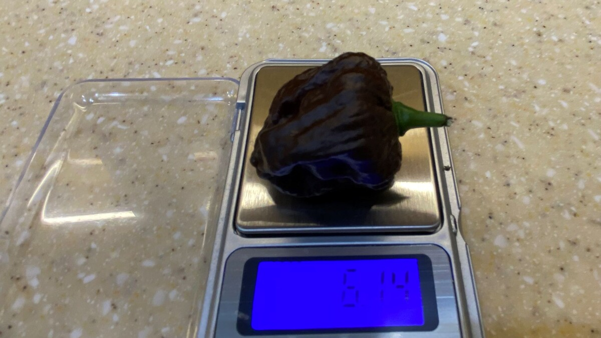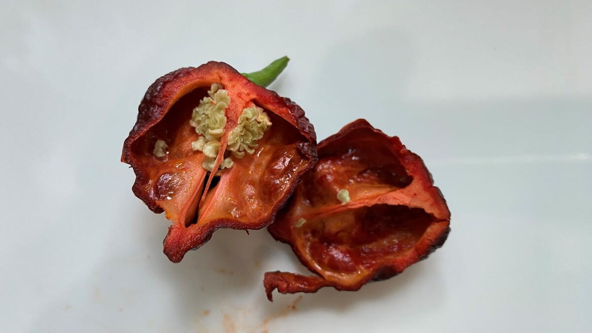 Тут наступает очередь нашего главного героя. Режем пополам и смотрим, что внутри. Разглядываем и расстраиваемся – капсаицинового масла в большом количестве как в прошлом году нет (прошлый год). Только небольшие капельки. Ну ничего не поделать. Такое лето…
