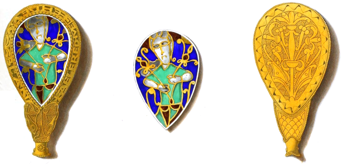 Называется оно Драгоценность Альфреда. Это явно наконечник от чего-то, в золотой оправе и с эмалевой вставкой внутри. Датирована драгоценность концом IX века. Техника перегородчатной эмали довольно сложна для того времени, изделие уникально и является одним из самых известных памятников декоративно-прикладного искусства англосаксов.