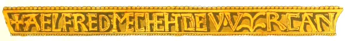 Атрибутировать изделие временем правления Альфреда Великого (871--ок. 900) помогла надпись сбоку на оправе. Надпись на староанглийском, без пробелов, некоторые буквы соединены между собой (лигатуры). aelfred mec heht gewyrcan примерно переводится как Альфред приказал изготовить меня.