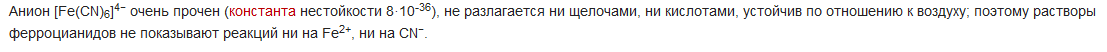 А это взялось вот откуда: формула гексацианоферрата железа, который очень легко образуется из железистосинеродистой кислоты, соответствует формуле цианида железа. Но это не цианид.