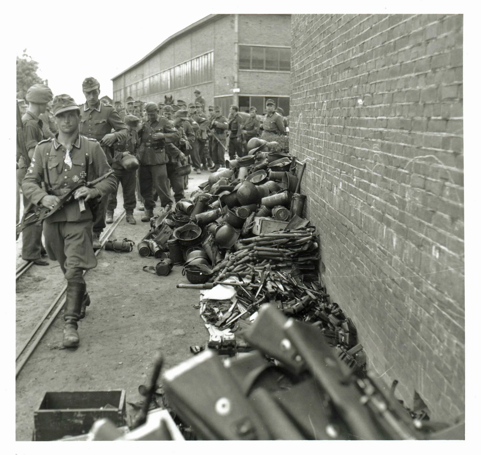 Солдаты 361-й народно-гренадерской дивизии вермахта сдают оружие на территории завода в голландском городке Марсен во время капитуляции. Фельдфебель с пистолетом-пулеметом MP 40 — ветеран боевых действий, на его кителе Железные Кресты 2-го и 1-го классов, Крест Военных заслуг 1-го класса, три нарукавных знака «За уничтоженный танк».