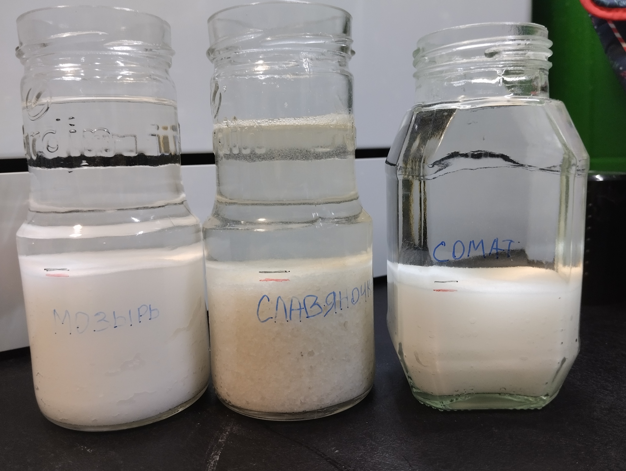 Видим заметное снижение уровня соли в каждой из банок. На славяночке проявился жёлтый осадок — наверное это тот самый песок.
