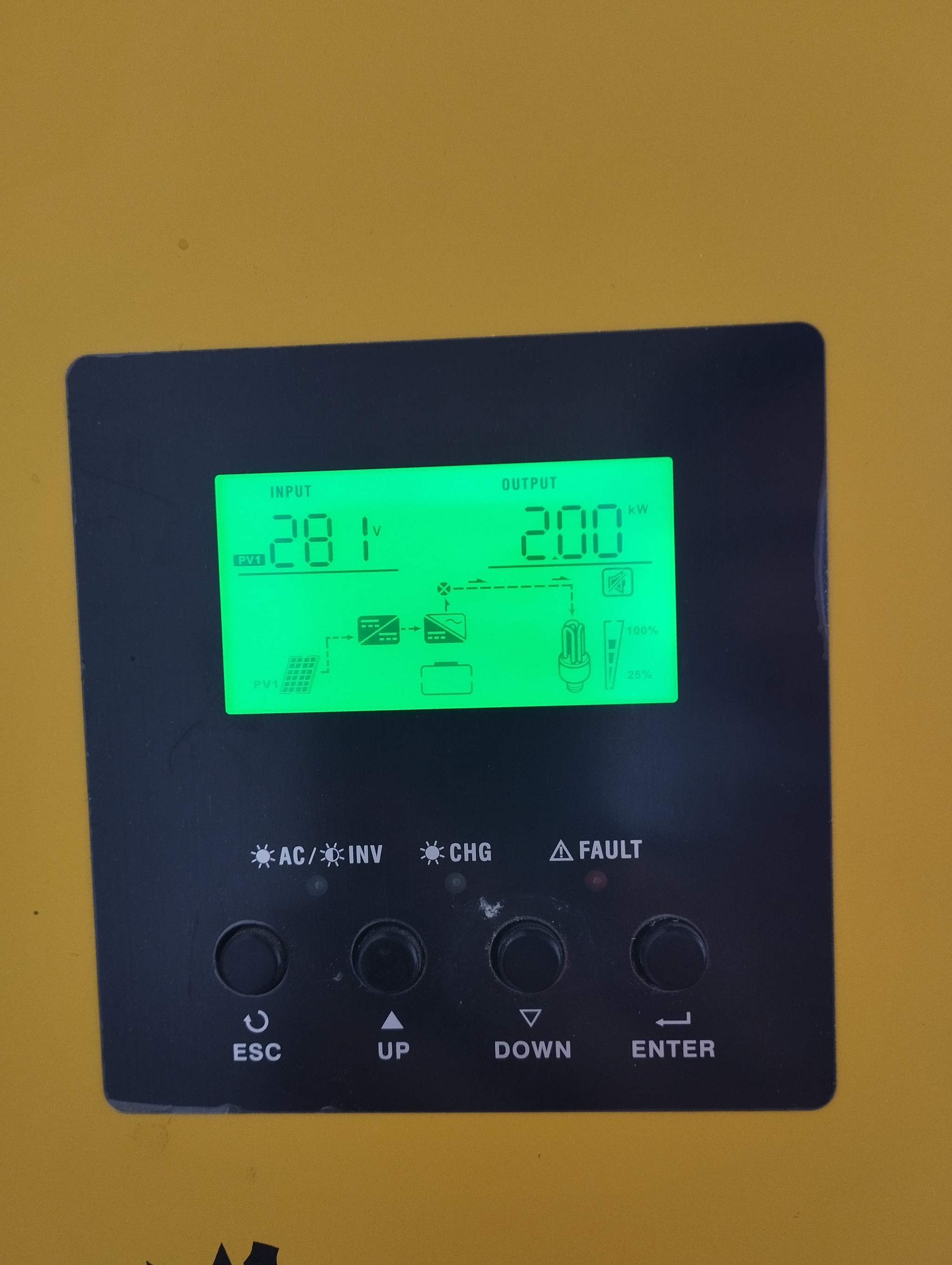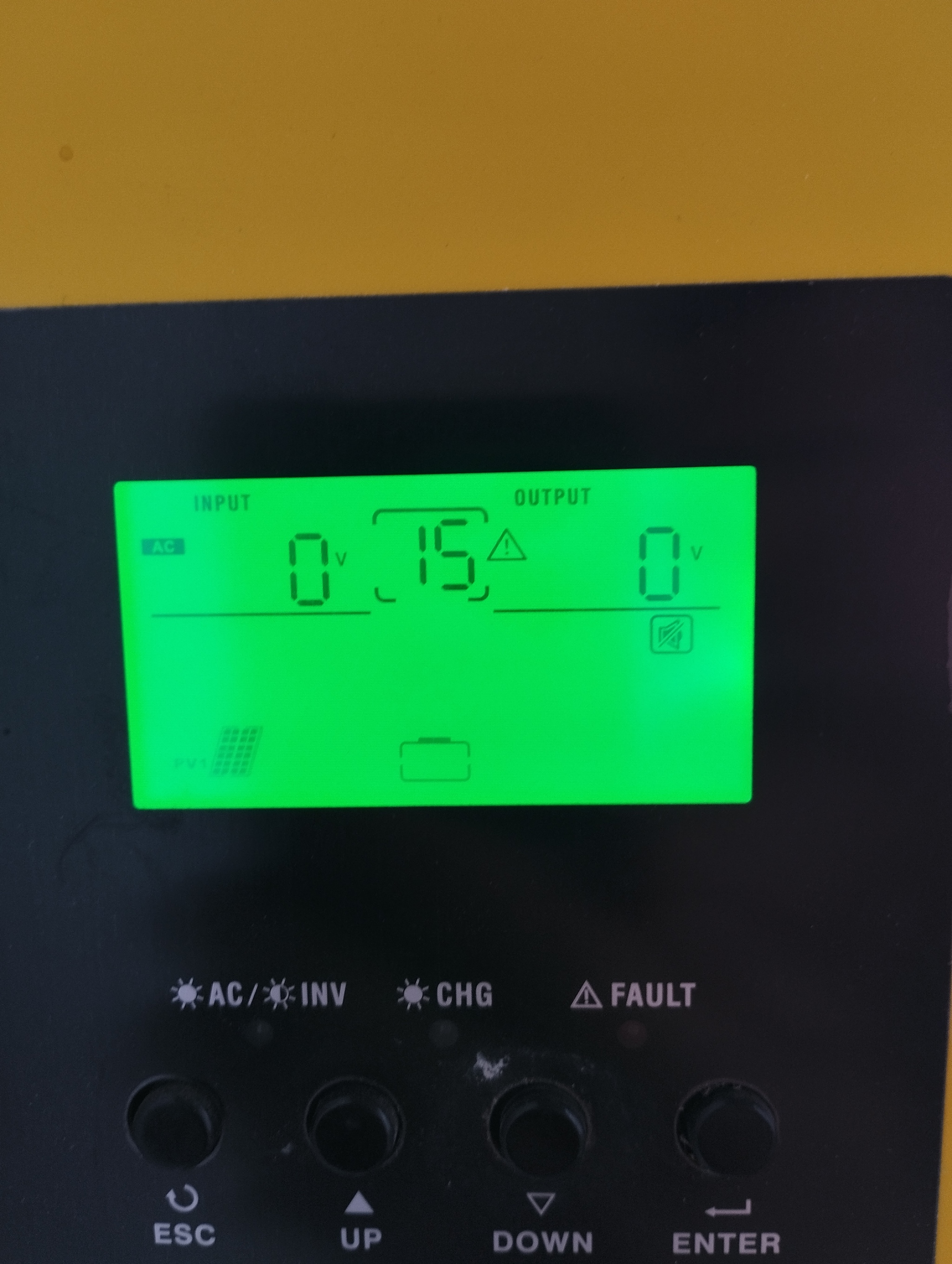 При отключении внешней сети и недостатке мощности от солнечных панелей инвертор уходит в аварию, из которой его можно вывести только полным отключением от всех источников энергии. Ошибка 15 - низкое напряжение солнечных панелей.