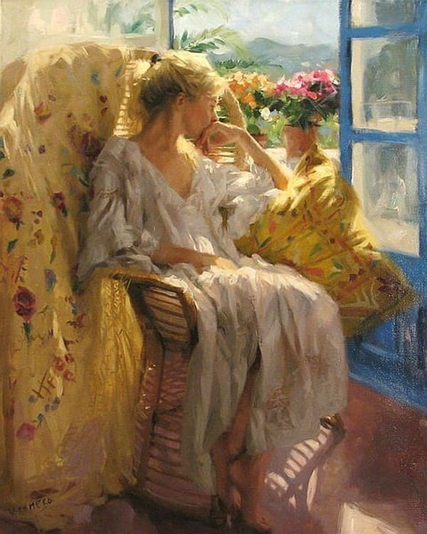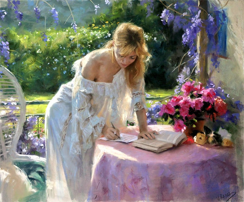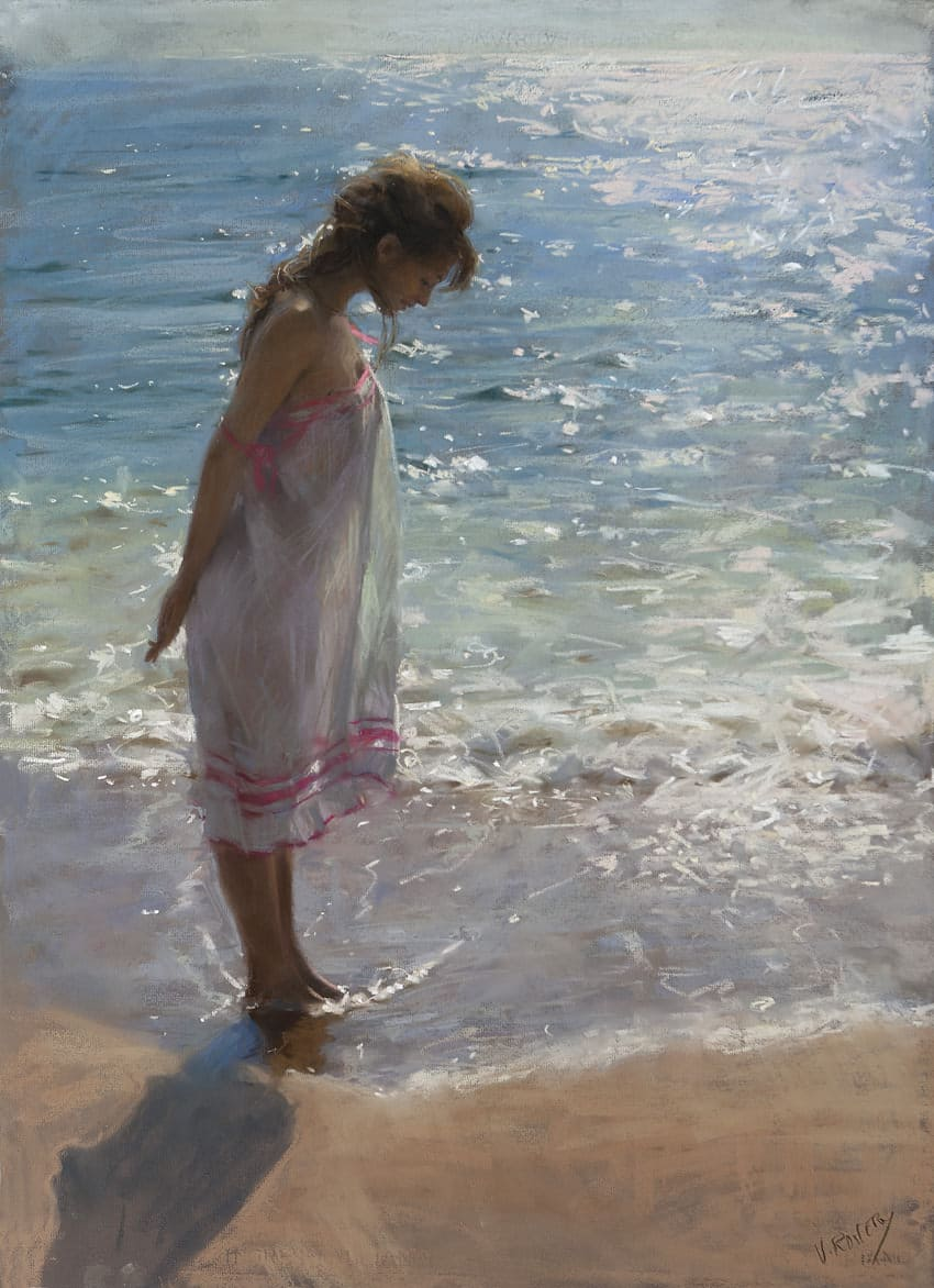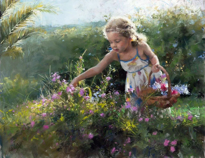 Vicente Romero Redondo великолепно освоил технику рисования пастелью, которая в полной мере позволяла мягко и нежно передать переливы света и цвета, игру теней и нежную красоту естественных красок.