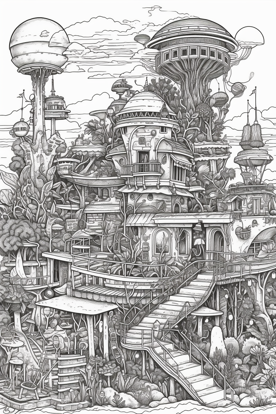 coloring book of a solarpunk garden, eco-friendly, black and white, outline art, vector, thick crisp line, --ar 2:3
