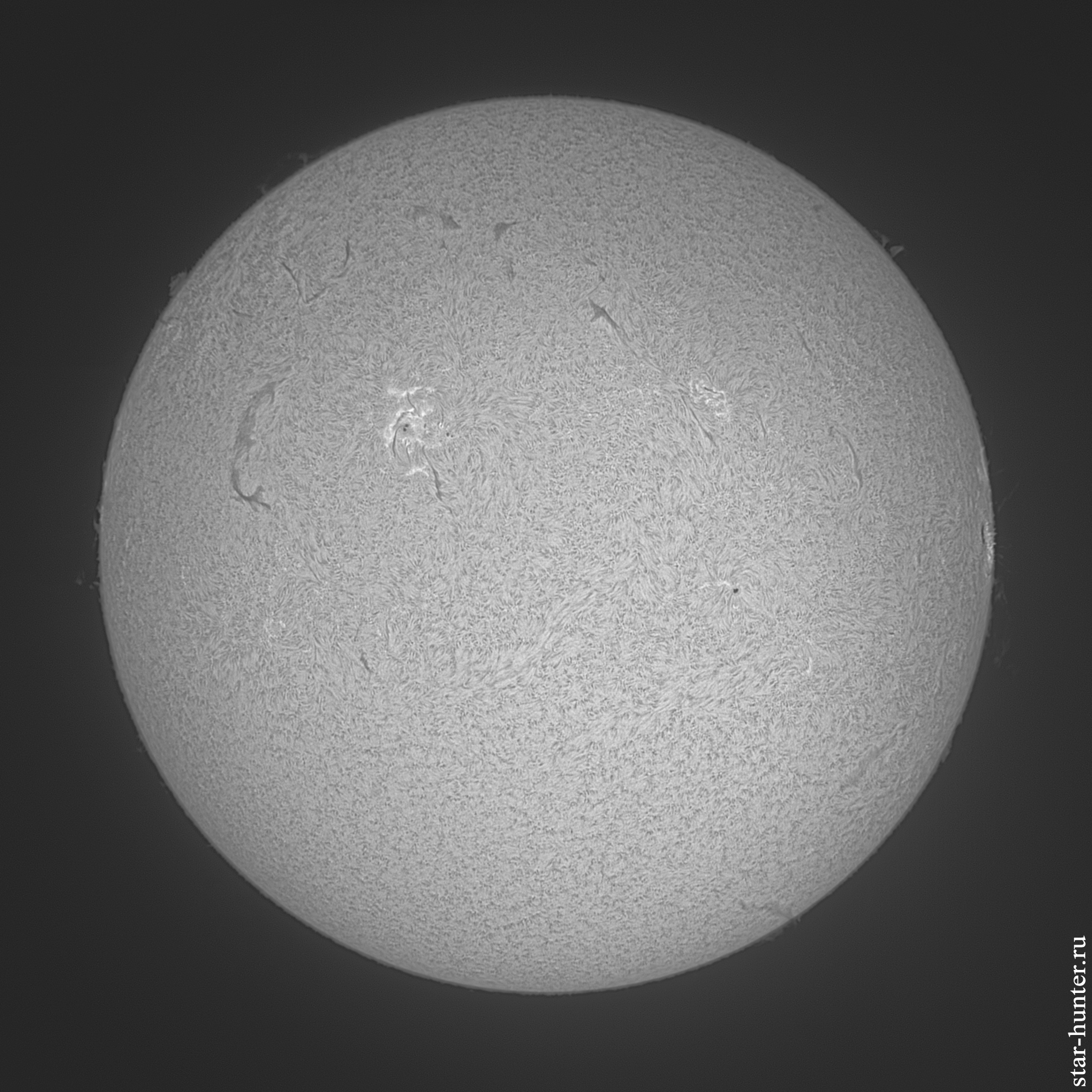 Снимок Солнца, полученный при помощи хромосферного телескопа на длине волны 656.28 нанометров. В этой области спектра видны различные образования во внешней оболочке Солнца — протуберанцы, волокна, активные области, вспышки, пятна, хромосферная сетка.