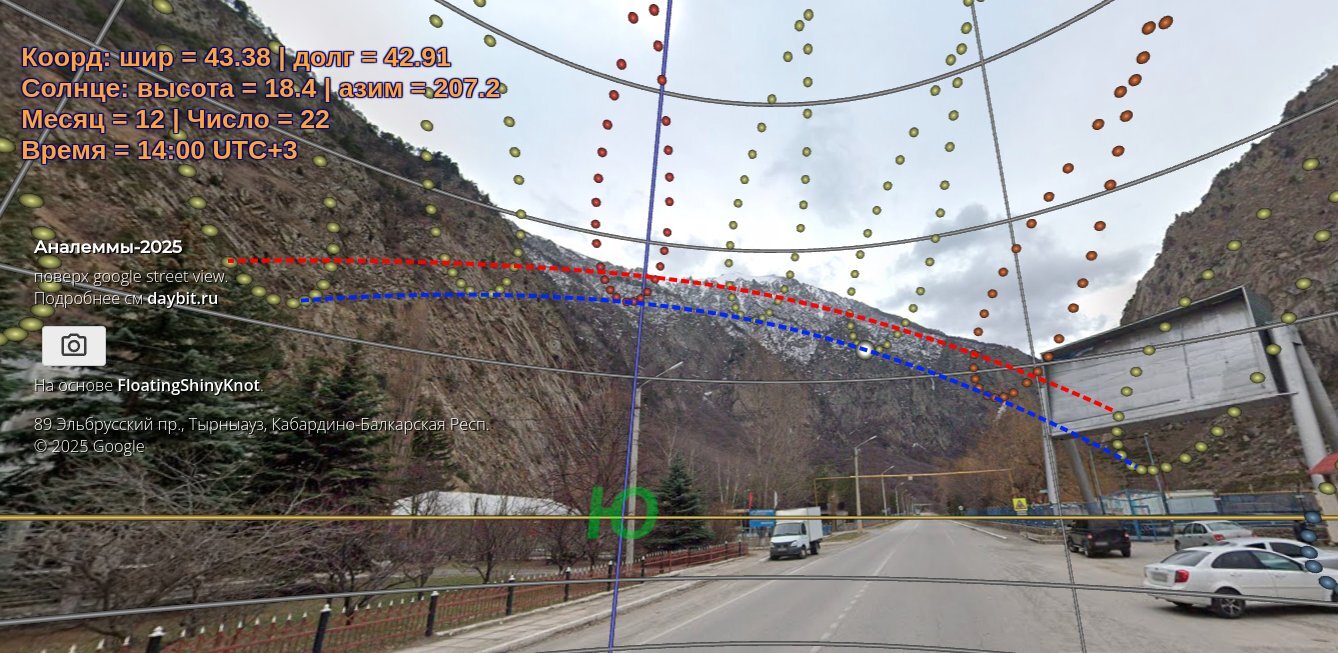 В заключение - скриншот примера, как можно использовать сервис. Например вот такая занятная точка в Тырныаузе (Кабардино-Балкария), в которой пару месяцев в году, от конца ноября (красным штрихом) до конца декабря (синим) и потом до конца января (опять красным), солнце не выходит из-за горного горизонта (этакая "горная полярная ночь"):