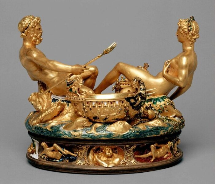 Первоначально Сальеру у Челлини заказал итальянский кардинал Ипполито II д’Эсте. В тот момент у мастера и возникла идея сделать солонку по-настоящему роскошной. Однако средств, которые выделял кардинал, было явно недостаточно для выполнения задуманного. Но, к счастью, иметь такое сокровище захотел король Франции Франциск I, у которого денег хватало с лихвой. Благодаря ему в 1543 году Челлини всё же создал свой уникальный проект, и Сальеру отправили ко двору французских монархов. Впоследствии в конце XVI века по воле Карла IX солонка в знак дружбы была подарена австрийскому эрцгерцогу Фердинанду Тирольскому. После чего Сальера хранилась в инсбрукском замке Амбрасс. В 1889 году драгоценность перевезли в венский Музей истории искусств, который был основан в том же году.