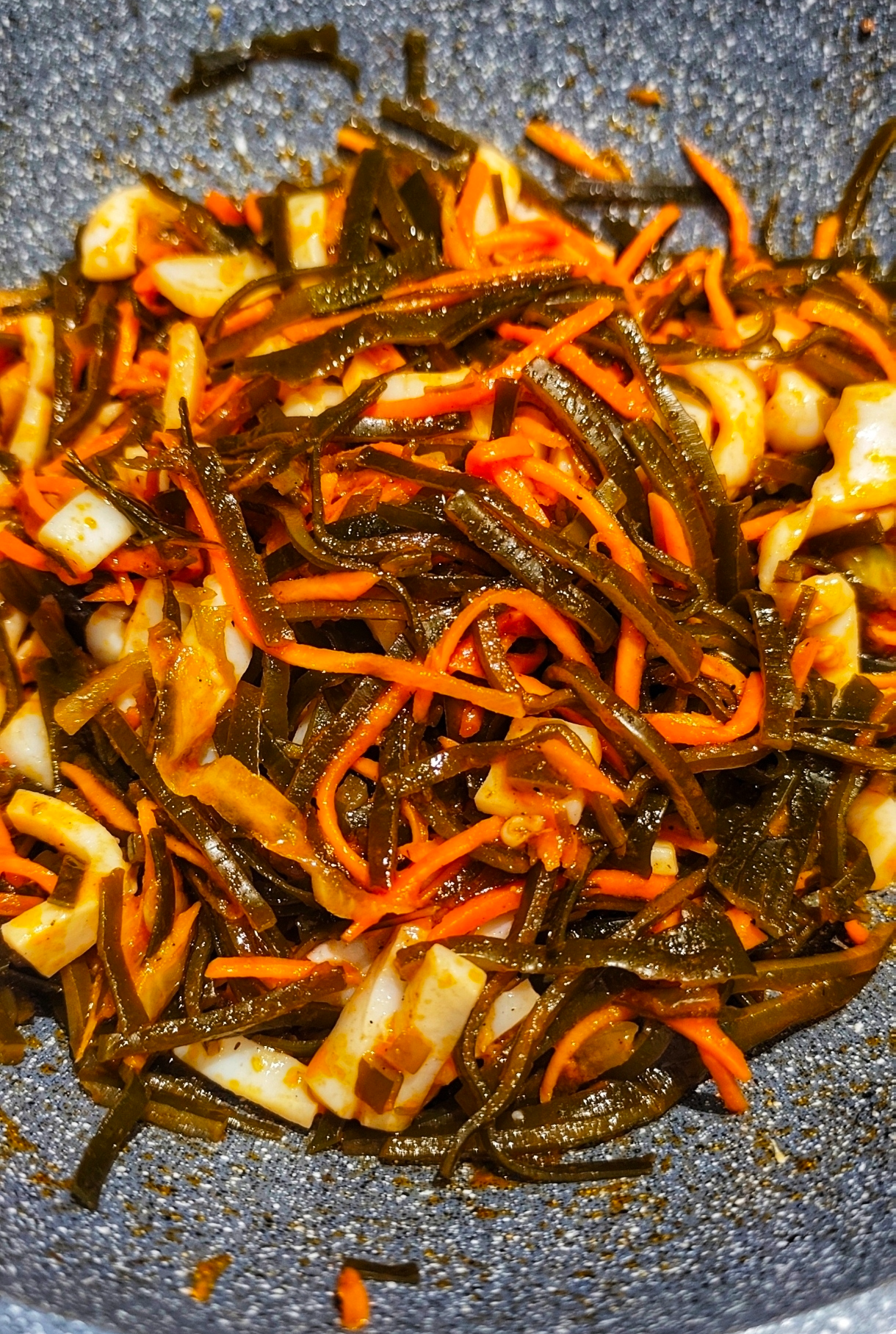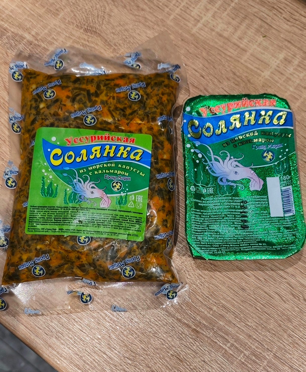 Сейчас много кто делает, в супермаркетах может быть целая полка этих солянок - и с кальмаром, и с мидиями, и с кукумарией