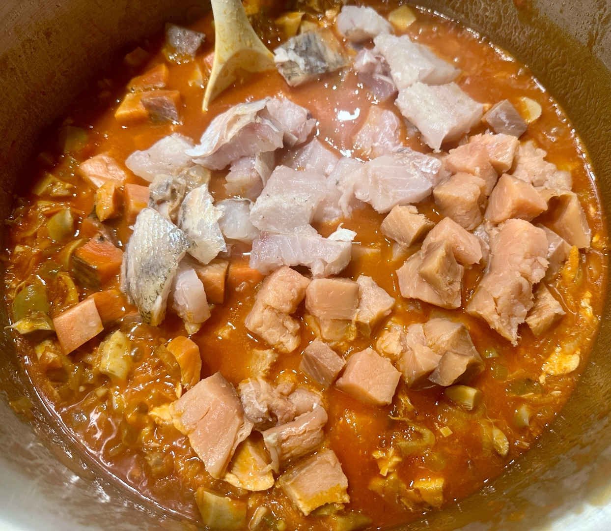 Да рыбе чуть прогреться и залил основу - заправку бульоном. Опять же, не устану повторять - деликатно (!) перемешал содержимое кастрюли.