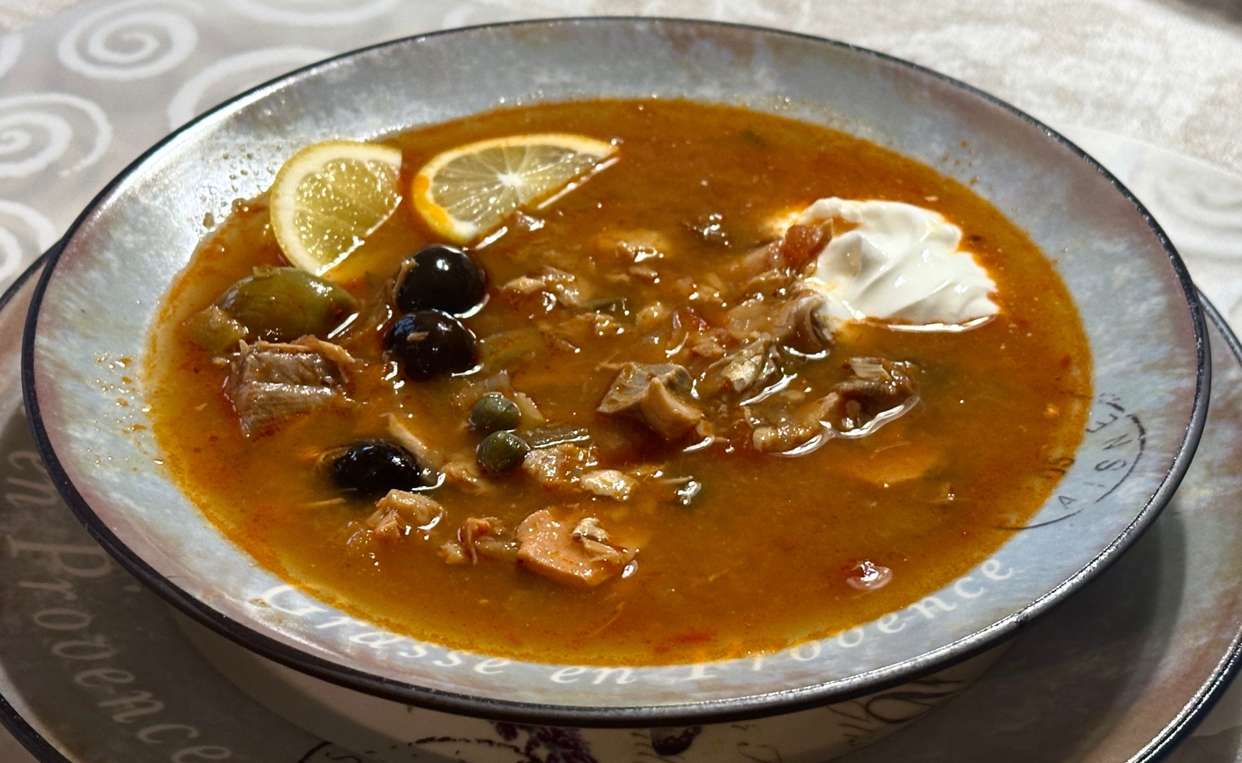 Двадцать пять минут томил я солянку. На очень низком нагреве. Даже взбулькивания не допускал. Это важно.