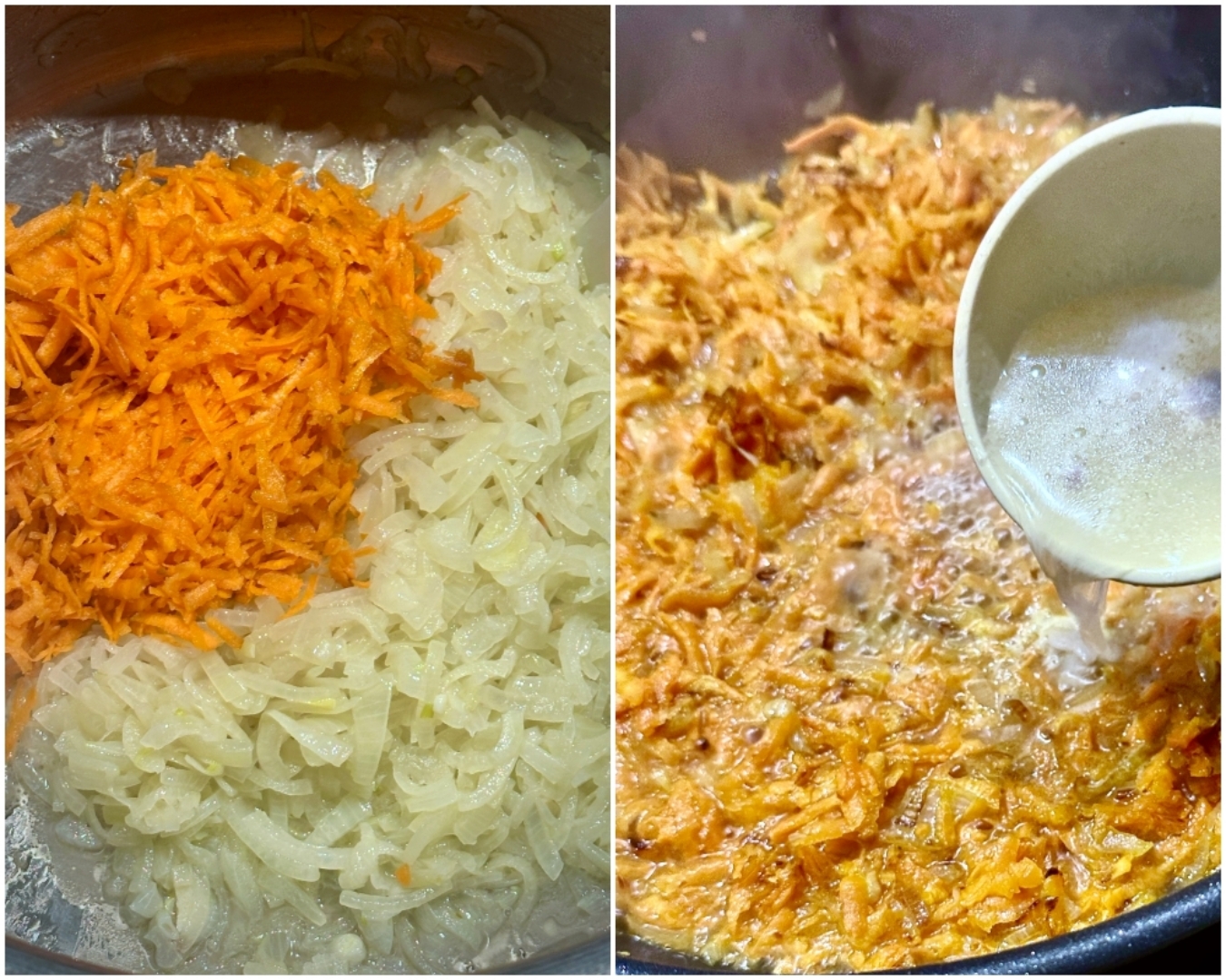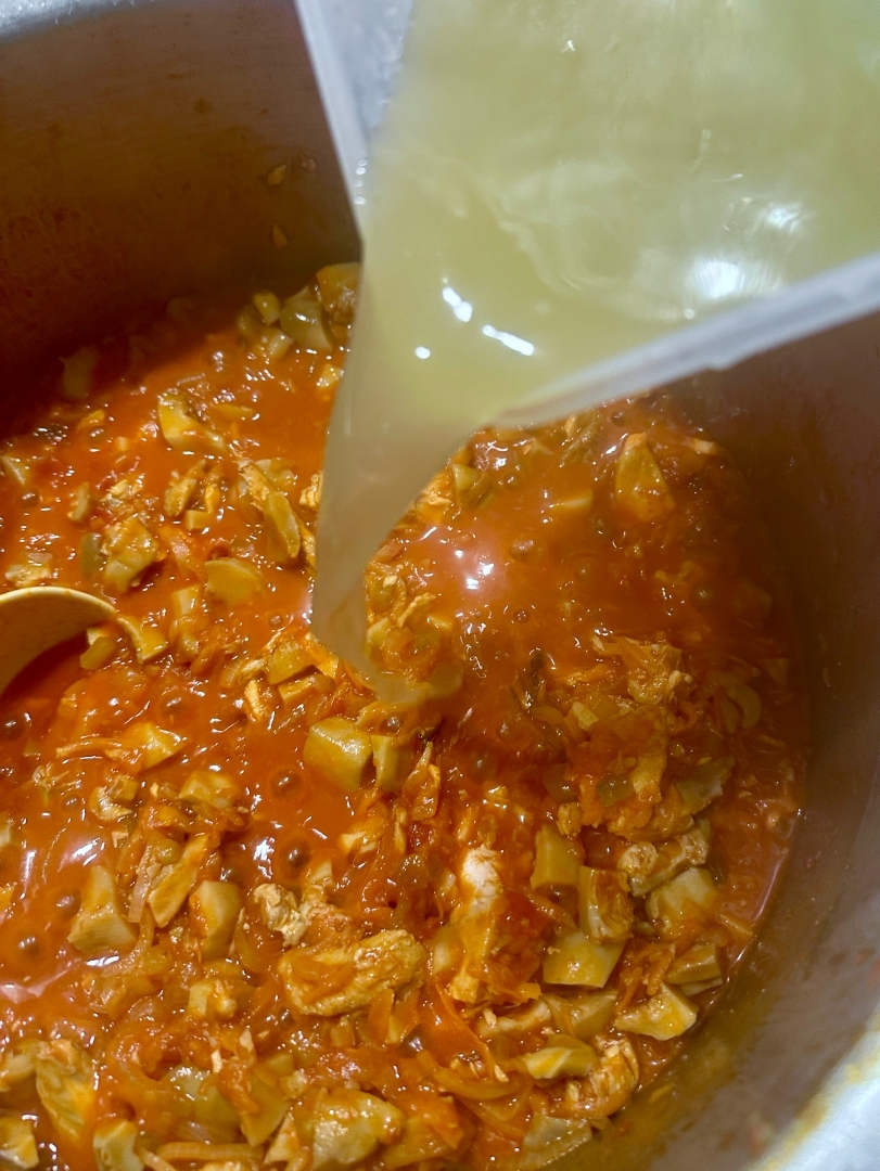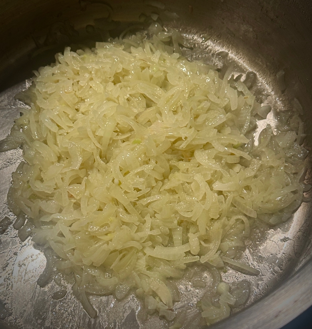 Как только лук хорошо прогреется, добавил толику бульона. Скорее даже жирок сверху бульона взял и добавил.
