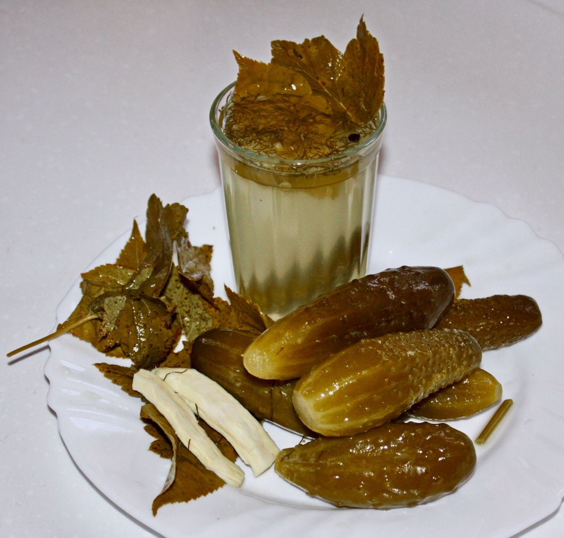 Огурцы надо брать только бочкового засола. С хренком чтобы, листиками вишневыми и смородиновыми, укропом и прочими составляющими правильного засола. Чем огурцы будут крупнее, тем оно лучше будет.