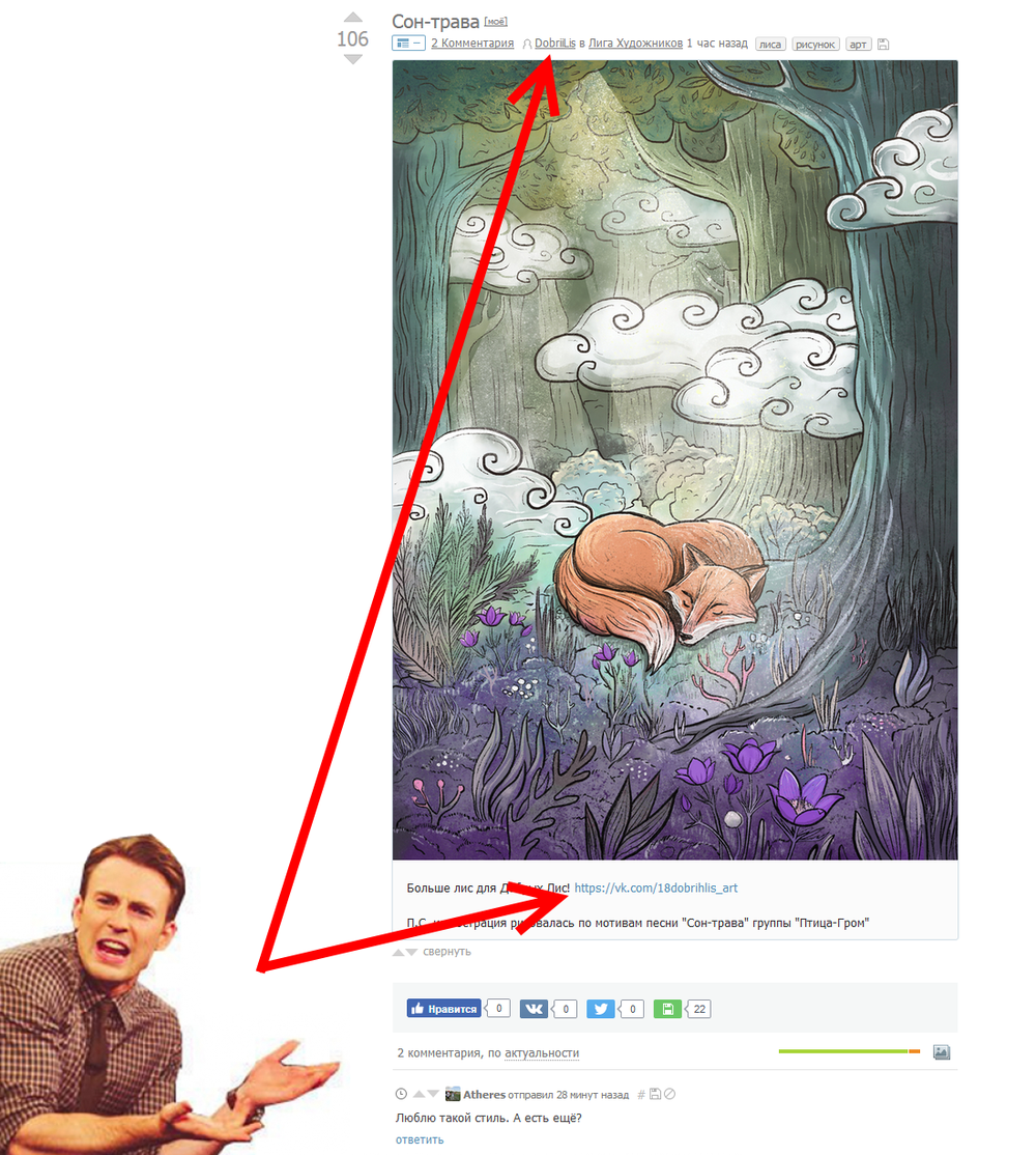 Очень просто ) Я зашел в аккаунт автора, посмотрел предыдущие работы и мне стало интересно, а есть ли еще работы, в любимом мною стиле, т.к. творения автора сделаны в разных стилях. И не только с лисами )
