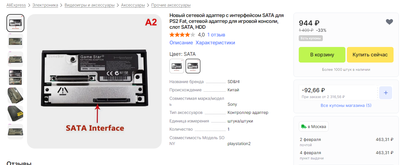3) Новодельный модуль(без сетевого компонента) для установки жестких дисков в Playstation 2 FAT 50000-й или 30000-й обойдётся примерно в 1300 рублей (продаётся и на Ozon, и на Aliexpress)