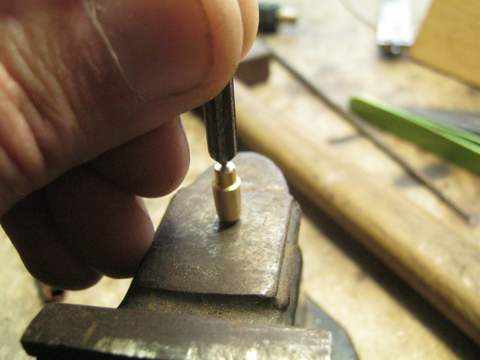 Фото 6. Обрезка технологической части заготовки. Длина оставленного такая, чтобы полнотелого стержня (от внутренней резьбы М3) осталось 5…7 мм. С запасом. В работе снова ювелирный лобзик. Пилочка №4.
