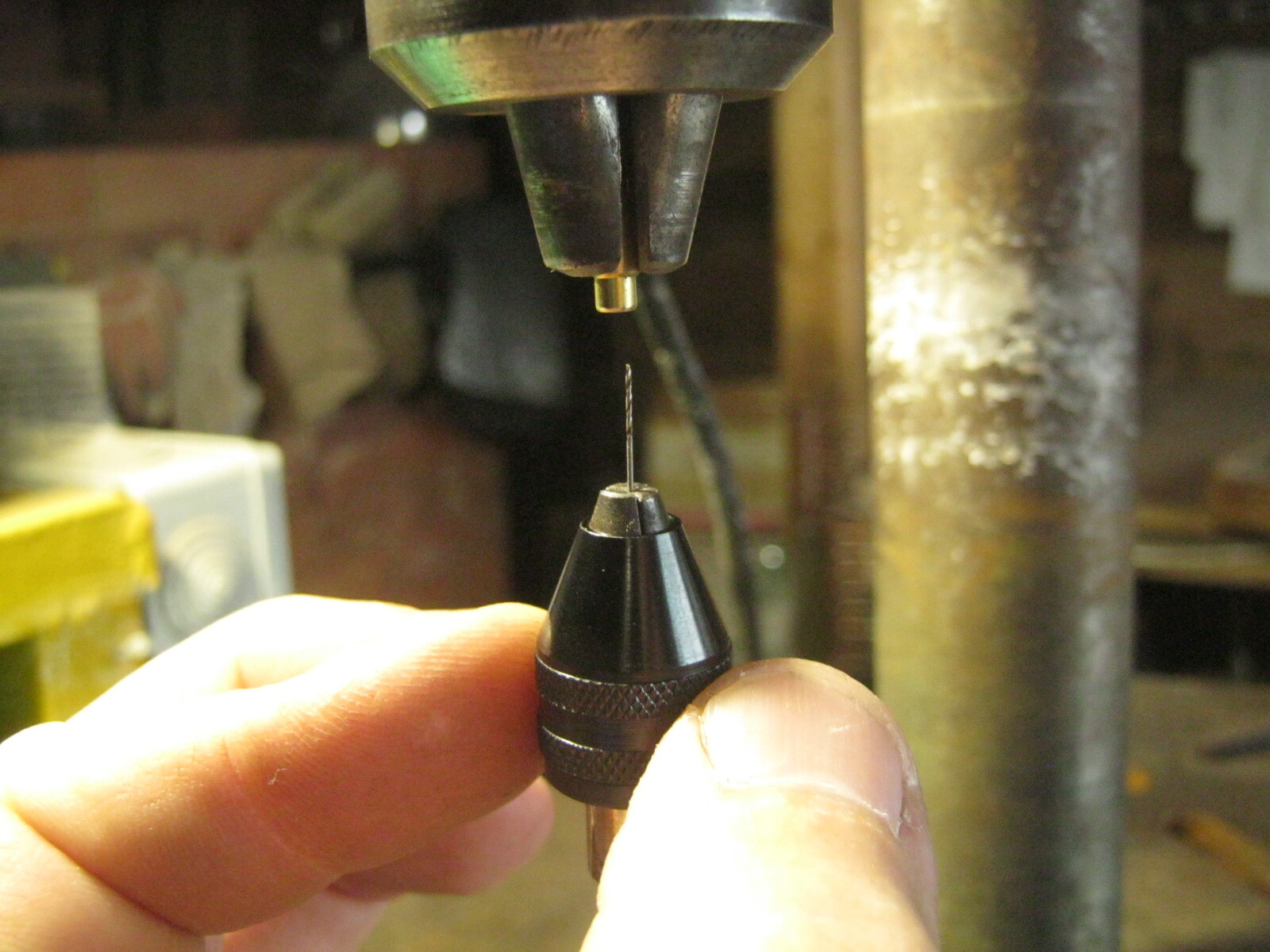 Фото 9. Сверло Ø3 мм. зажал в миниатюрный патрон, заготовку сопла – в патрон сверлильного станка. Обороты средние. Сверление наоборот, неподвижным сверлом, позволяет относительно точно сделать соосное отверстие.