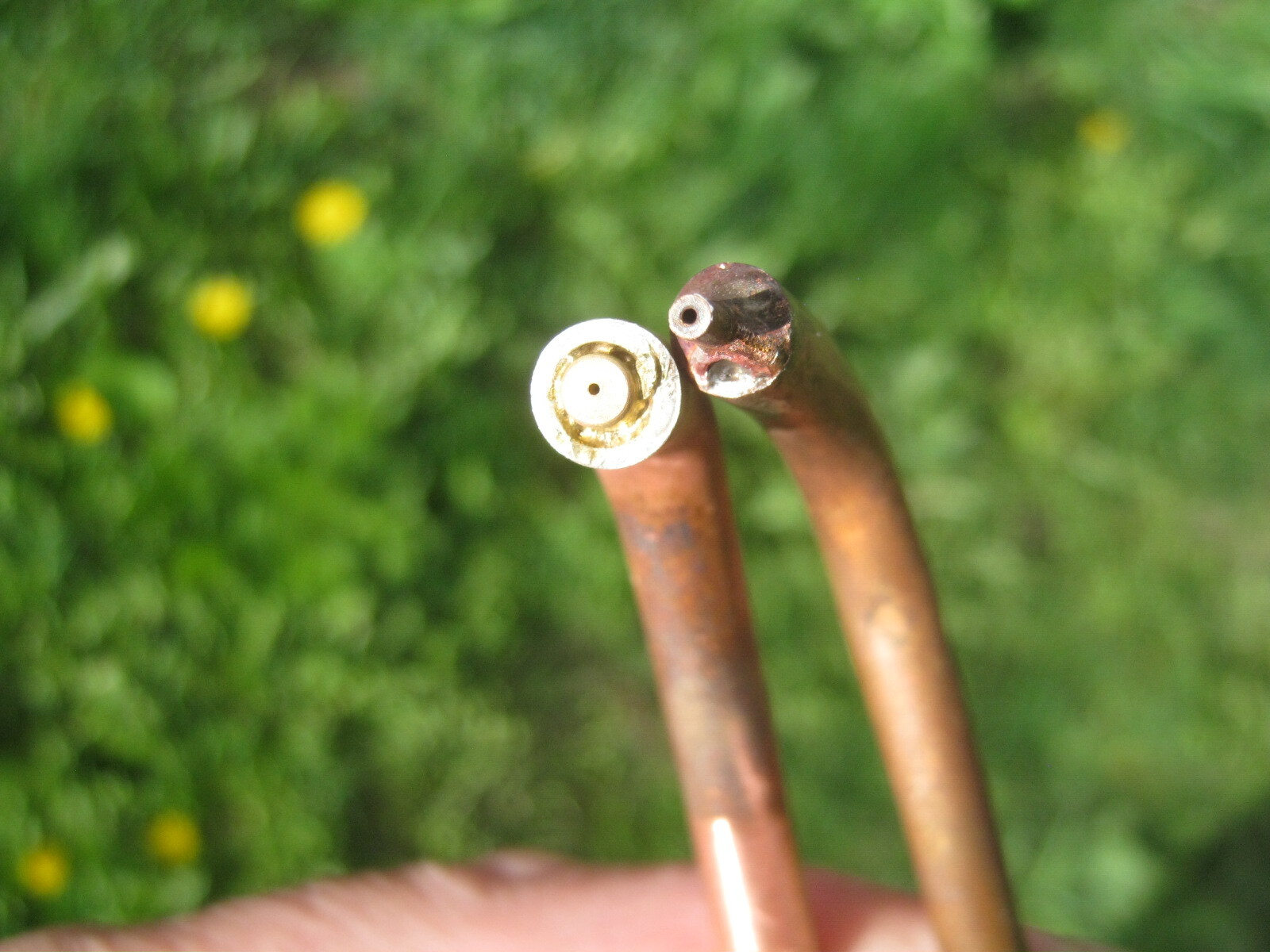 Фото 18. Два наконечника микрогорелки – старый, Ø 0,7 мм. из медного капилляра впаянного медно-фосфорным припоем, новый Ø 0,3 мм.