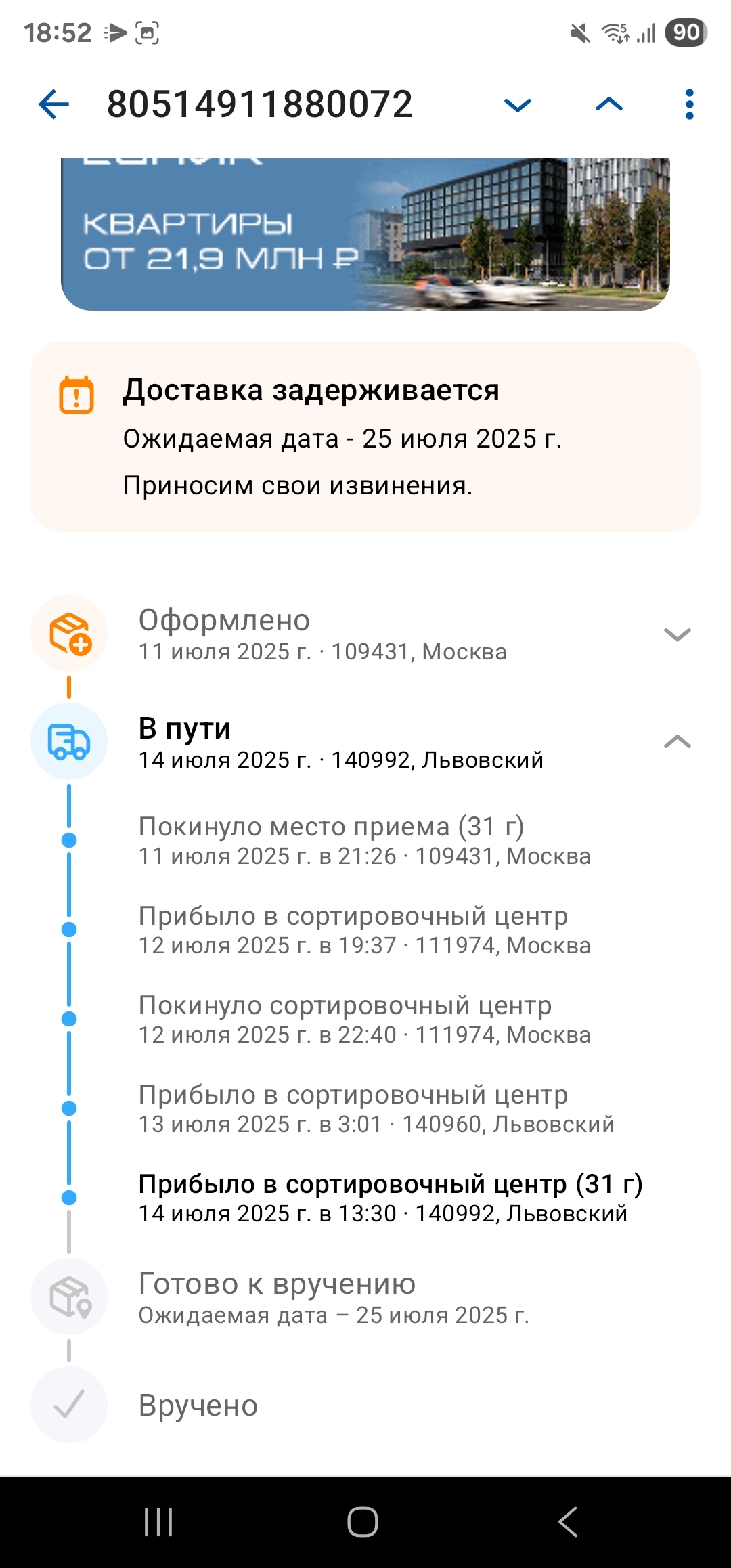 В сортировочном центре Львовский с 14-15 июля висят три (!!!) моих отправления, номера треков: 80514911214433, 80514911880072, 12546610509595. Ранее 8 апреля в том же Львовском утеряна моя посылка, трек 80510508063484 (заявления о розыске этой посылки подавались неоднократно и на сайте Почты, и в чат-боте Почты в Телеграм, и на странице Почты в ВК. Толку ноль!). Почта России, что происходит в Львовском? Куда массово деваются пропавшие посылки и отправления? Ответьте пожалуйста не отпиской, что вы с ними делаете? Просто интересно! Это же, судя по массовым жалобам на Львовский, даже не грузовики, это наверно уже морские контейнеры с посылками, не доставленными по адресу и зависшими в Львовском!