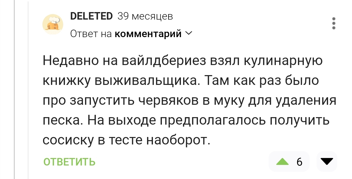11 skitls187 13 дней назад Сосиска в тесте наоборот #comment_243329093 Кулинария Дождевые черви Мука Фастфуд Кулинарная книга Комментарии на Пикабу Скриншот 1 Ещё 0