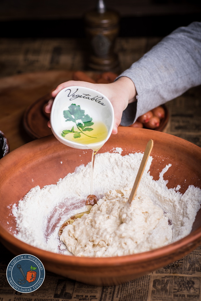 - Добавить муку и с помощью длинной ложки или лопатки все смешать. Продолжать вымешивать удобнее руками. В процессе добавить растительное масло.
