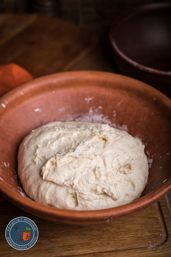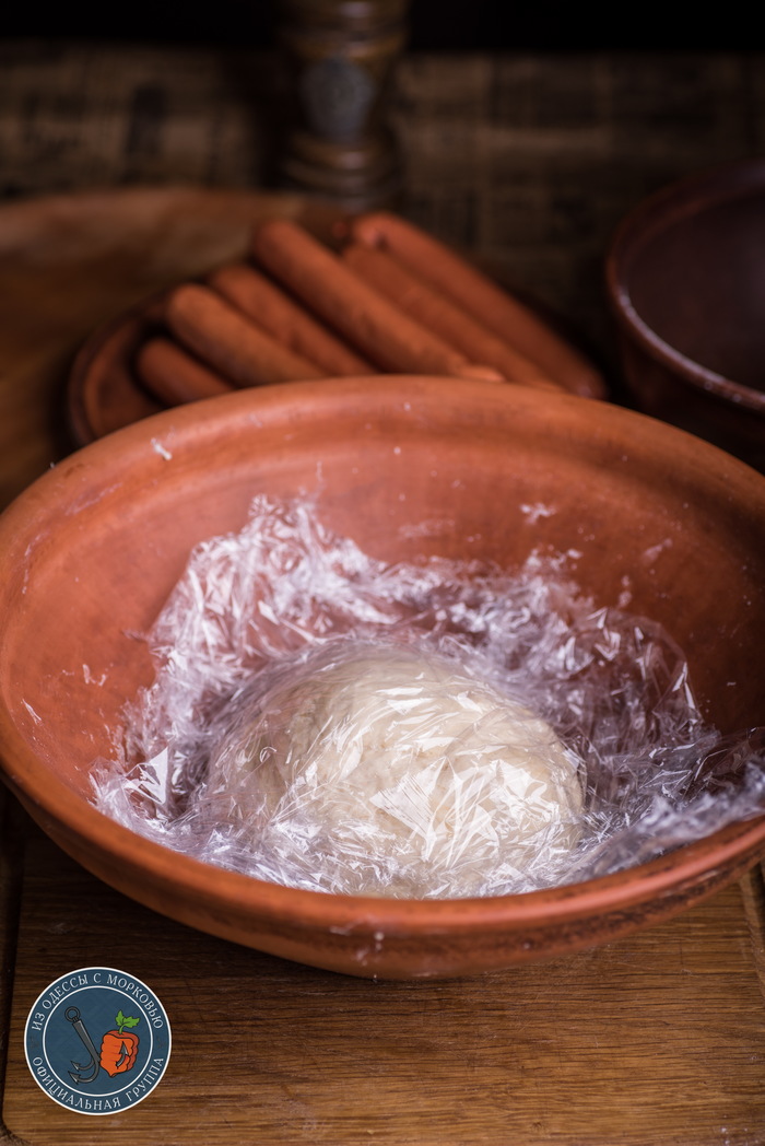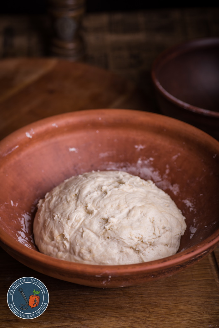 - Как только тесто соберет на себя всю муку с дна и стенок, собрать его в шар и накрыть пленкой. Оставить на отдых в теплом месте на полчаса-минут 40.